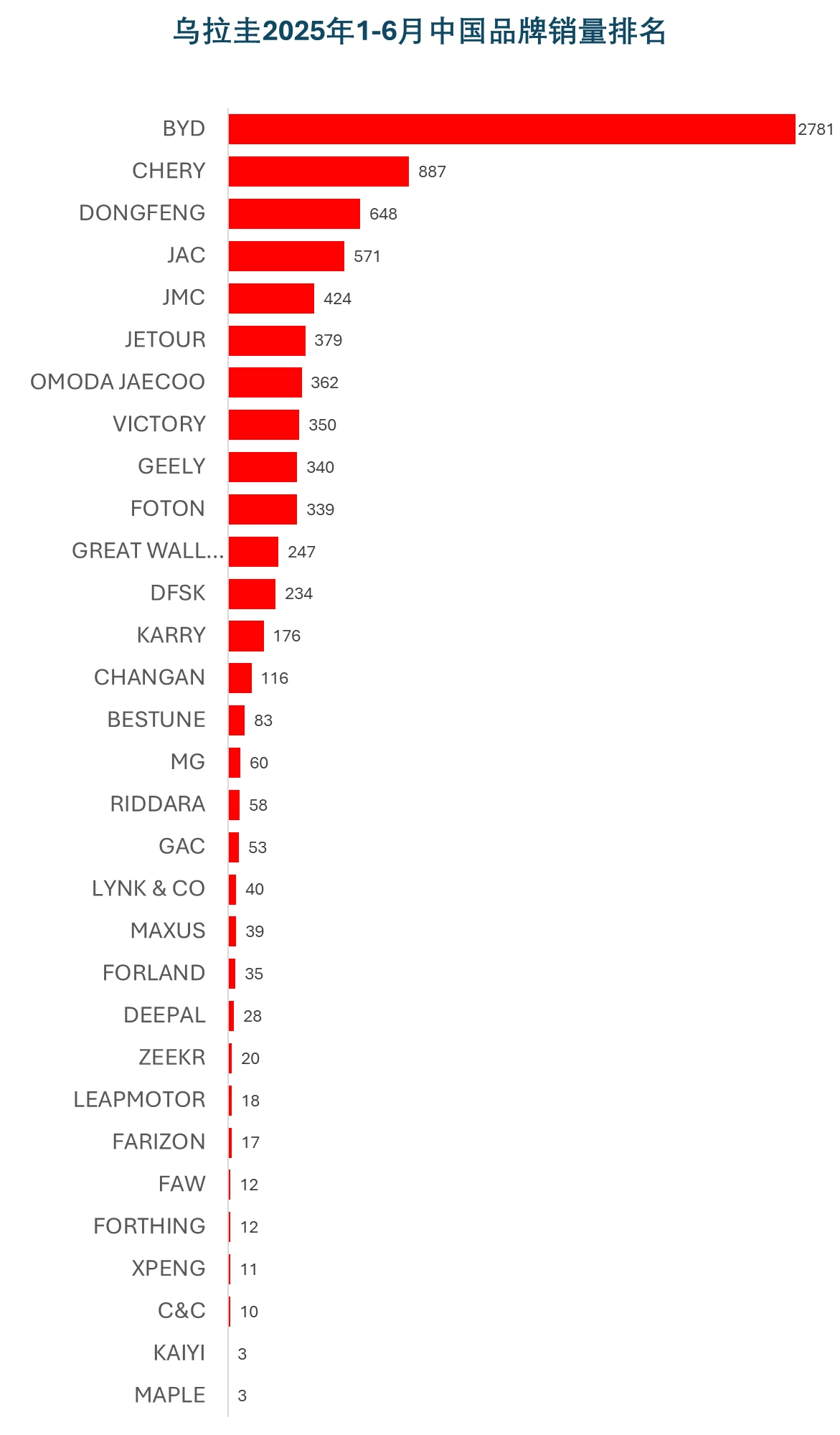 乌拉圭汽车市场不大,以比亚迪为代表的中国车企正在刷足这个小市场的存在感。经济型轿车和紧凑型SUV是该国市场的主要推动力,新能源车型获得了更多当地用户的认可,中国品牌有望占据更多份额。 31个中国品牌竞逐乌拉圭市场,每4辆新车就有一辆来自中国 今年1-6月,乌拉圭汽车市场累计销量同比增长8.2%,达32000辆。其中,乘用车占36%,SUV占30%,轻型商用车占29%。菲亚特以15.2%的市场份额位居第一,雪佛兰以9.6%的市场份额位居第二,雷诺以9.0%的市场份额位居第三,比亚迪以8.7%的市场份额位居第五。 截至今年上半年,有31个中国品牌进入乌拉圭市场,依靠集中爆款、短期促销与密集铺网的三位一体策略建立了良好的市场基础。在上半年销量中,中国品牌占26.1%的市场份额,每售出四辆新车中就有一辆来自中国。比亚迪、奇瑞、东风为畅销中国品牌的前三名。可以说,在乌拉圭,是比亚迪和奇瑞推动着中国品牌整体市占率接近三成。 比亚迪的纯电动及插电混动车型在乌拉圭市场定位清晰、价格竞争力强,适合城市用车和地方采购需求,成为新能源领域的绝对主力。奇瑞稳居乌拉圭市场中国品牌第二位,其小型SUV产品线兼顾性价比与空间实用性,深受当地家庭用户欢迎。 2024年,拉丁美洲的电动汽车市场份额已达4%,2025年这个数值还在增长。国产电动车占有率较高的拉美国家正是巴西和乌拉圭,乌拉圭达83%,其后是哥斯达黎加、厄瓜多尔和哥伦比亚,均超过了50%。 拉丁美洲能源组织(Olade)的数据显示,按人均电动汽车数量计算,哥斯达黎加以每1万居民拥有34.3辆电动汽车位居榜首,乌拉圭以17.4辆排名第二,巴西以7辆位居第三。 中国电动摩托车攻略乌拉圭市场,布局设厂旨在拉美市场腹地 摩托车是拉美国家居民日常生活的必需品,多个拉美国家的摩托车保有量占交通工具总量40%以上,年配件需求超过50亿美元。乌拉圭摩托车市场规模较小,但消费能力不弱,尤其偏爱中高端车型。此前当地的主导车型是本田、雅马哈和铃木等日系摩托产品,中国电动摩托车因价格、续航等优势逐渐打开市场局面,乌拉圭本身制定了环保政策和标准鼓励使用电动摩托车。 让中国摩托车企业心动的是,乌拉圭是南方共同市场的正式成员国,与巴西、阿根廷、巴拉圭等国形成关税同盟,上述国家都是摩托车消费大国,市场规模远超乌拉圭。这意味着,中国企业不只可以在乌拉圭销售中高端摩托车产品,若在此设厂,生产的摩托车可快速进入巴西、阿根廷等市场,价格和物流优势显著。 有一个细节是,虽然在电力领域实现了99%的可再生能源覆盖,但乌拉圭的问题在于电价的居高不下,2024年乌拉圭居民电价为每千瓦时0.24美元,远高于全球平均值0.16美元。当然,这和其2024年人均GDP已达23052美元,接近发达国家水平一比,也还能接受。 乌拉圭的经济结构与发达国家非常近似:传统畜牧业相对缩小,制造业在开放竞争中持续萎缩,旅游、金融、IT等服务业成为增长亮点。