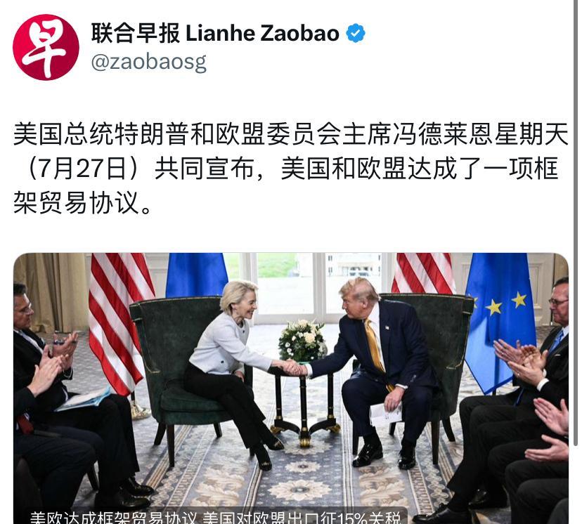 联合早报今天报道:“美国总统特朗普和欧盟委员会主席冯德莱恩星期天(7月27日)共