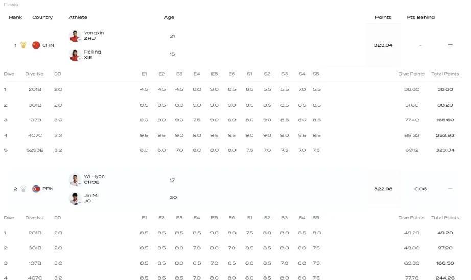 07月27日,全红婵的省队小师妹谢佩铃,在10米混双决赛中,发挥失常,第一跳炸鱼,仅得36.6分,排在最后一名,进入第二轮快速调整状态,排名也前进到第九位,然后跟搭档朱勇鑫在第三跳中,排名来到第一名,最后有惊无险夺得10米混双金牌,感觉看这样的比赛,简直就像过山车一样 谢佩铃和朱勇鑫总分323.04分夺得冠军,朝鲜队322.98,获得银牌,真是好险啊,单人10米比赛加油