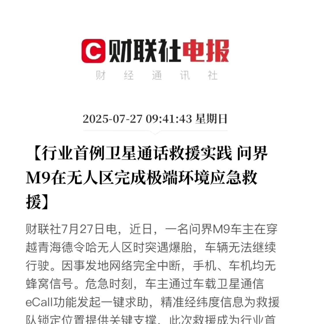 余大嘴也没想到,有人单枪匹马开着m9到青海德令哈无人区霍霍车,果不其然爆胎了,还好问界的卫星通讯功能救了车主一命,救援团队从德令哈市区启程,翻越3座大山,驶入全程100公里非铺装牧民小道,驰援途中,救援团队与车主通过卫星语音保持通话61分钟,实时沟通救援进展。当年发布m9大嘴说的卫星通讯,很多人不以为然,结果却是救命功能,大嘴吹的牛又实现了一个,这你受得了么?