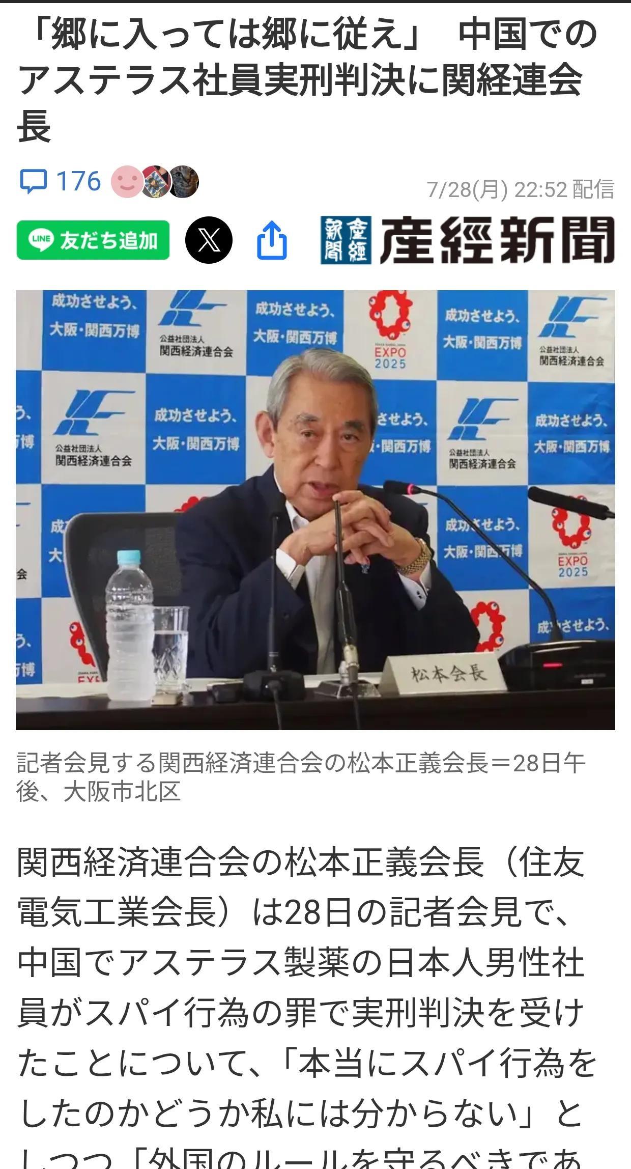 关西经联会长:没有中国,日本无法立足 日媒《产经新闻》报道:7月28日下午,关西经济联合会会长松本正义(住友电气工业株式会社会长)在新闻发布会上表示,安斯泰来制药一名日本员工因在中国从事间谍活动被判入狱,他表示:“我不确定是否从事间谍活动,但日本人要遵守国外的规则,学会入乡随俗”。 松本表示,他本月中旬访问北京,参加中国政府下属的商业集团举办的展览,并强调“没有中国,日本就无法立足”。