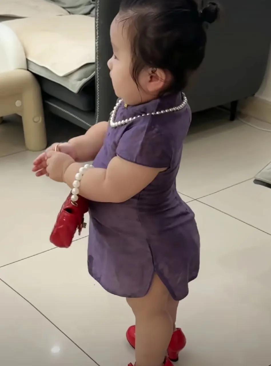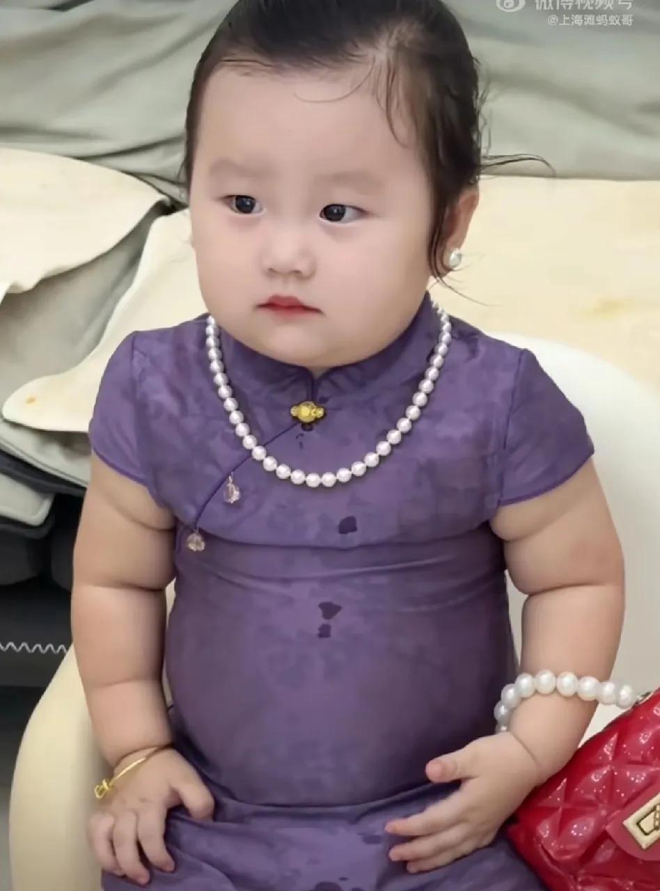 这小宝贝打扮的也太好看了吧!小旗袍穿的也太漂亮了。这位妈妈会打扮孩子,珍珠项链都戴上了,三件套,项链,耳钉,还挎着个小包包。脚蹬红色的小皮鞋,配红色小包,这胖乎乎的小脸蛋真可爱,粗胳膊粗腿的好富态。主要这旗袍也太紧身了吧!看把孩子裹的太不舒服了,主要看这表情拿捏的恰到好处。小姑娘太淡定了,是一丝笑容也没有,真像一个小富婆啊!太好玩了。好喜欢这个小宝贝啊!#国风旗袍女童# #萌娃旗袍秀#