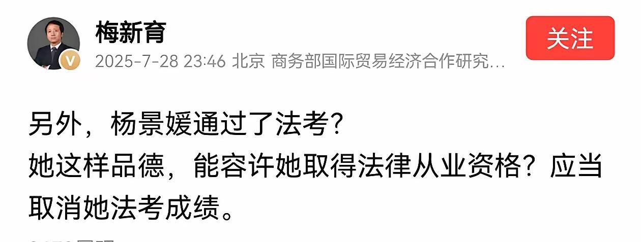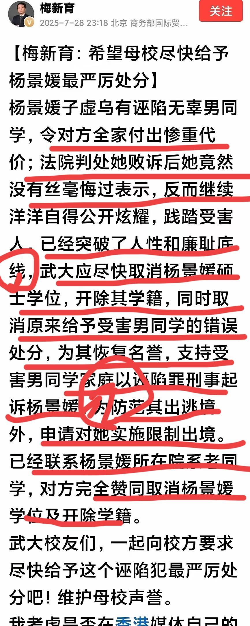 武大保研女的恶行,连校友都看不下去了! 商务部研究院——梅新育:号召武大校友集体向校方施压,要求武汉大学尽快处分杨景媛,维护母校荣誉!同时表示也许会在香港媒体呼吁香港浸会大学,取消杨景媛的博士生录取资格! 梅新育表示: 杨景媛诬陷小同学的行为已经突破人性和廉耻底线,在法院已经判她败诉的情况下没有丝毫悔过,还洋洋得意公开炫耀,实在是太恶劣了! 对此,梅新育还提出了几条建议: 首先,杨同学应该向小同学道歉并恢复他的名誉,同时支持肖同学全家以污蔑罪进行刑事起诉,维护自己的权益; 其次,武汉大学应该尽快给予杨景媛最严厉的处分:取消其硕士学位,开除学籍; 再次,对杨同学申请出境限制,以防止其为了逃避责任出境潜逃,继续污蔑和抹黑杨同学,甚至波及更大的层面! 梅新育称: 自己还尽快会考虑是否会在香港媒体的专栏发文,要求香港浸会大学取消杨同学的博士生录取资格!这件事实在是太气人了!自己7月18日刚在香港《信报》发表《过度女权成中国经济重大风险障碍》,没想到为自己文章提供论点、论据的,竟是自己武汉大学的学妹! 看得出来,梅新育被这位校友气得不轻!也对杨同学这样的行为十分愤怒!这件事实在是太恶劣了!一位法专业的学生,不仅没有依法尊重男生的权利,还知法犯法偷拍并污蔑别人,甚至在自己败诉的情况下仍然我行我素自鸣得意,势要将对方踩进泥里毁其一生!甚至还发信息威胁法院和男方父母,声称要让对方父母坐牢! 嚣张,实在是太嚣张!这样的行为是个人都看不下去!怎么会有人如此狠?用自己的专业知识去毁掉自己的同学呢?实在是太过分了! 作为网友,我很支持梅新育的观点!大家觉得他说的对吗? ~~~~~~~