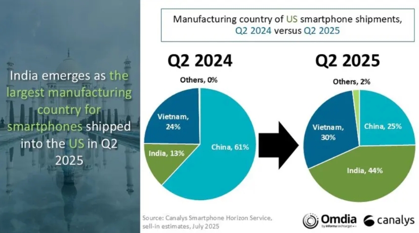 今年第二季度美国销售的智能手机,44%印度产,30%越南产,25%中国产