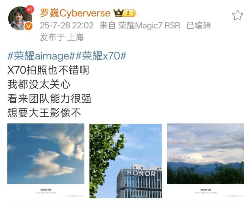 荣耀Magic6用户要哭了 这谁受的了啊? 大王影像普及率这么高了吗?想当年等大王影像的更新可是盼星星盼月亮啊。结果罗巍竟然表示,千元档的荣耀X70也可以有大王影像,这大王影像的普及率和普及速度也太高了吧?千元机啊,影像不是能扫码就行吗?你竟然还想给他大王影像,吗接下来的荣耀Magic8影像是不是还要继续升级啊? 那大王影像之后,再是啥影像呢?
