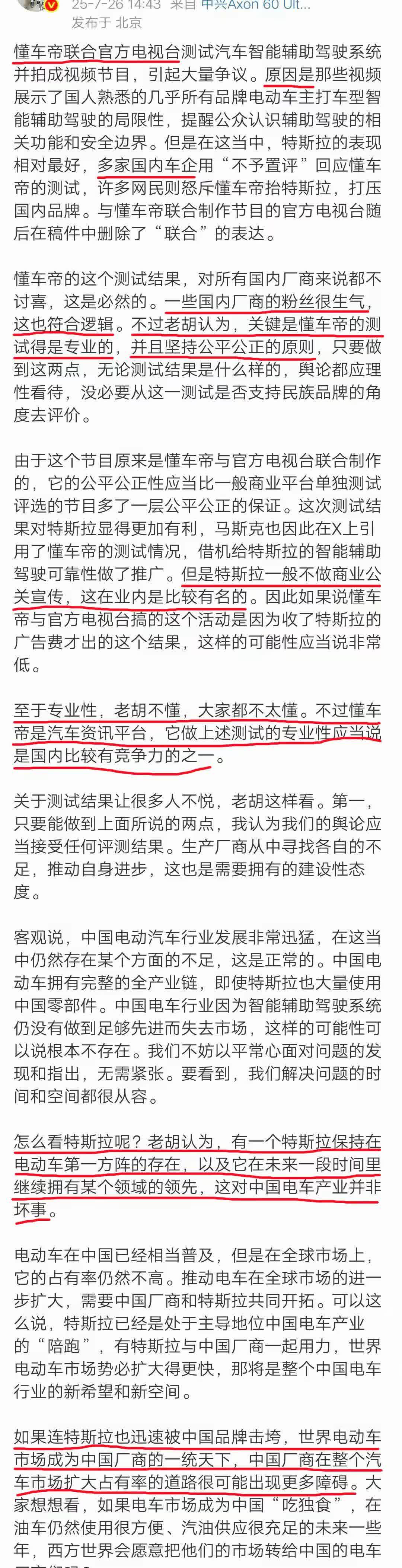 【支持懂车帝测评结果的人,请不要回避】 发现一个很有意思的现象,当我们在讨论懂车帝测评的测评方案和过程中存在的技术问题导致结果不客观时,像老胡等一众支持懂车帝测评结果的媒体人,对测评过程中存在的问题都选择避而不谈,反而大谈特谈什么原则、立场、胸怀、情感等一众感性问题。 当然,作为媒体老江湖的老胡,一句轻飘飘的“至于专业性,老胡不懂”就把讨论技术、专业性的问题避开了。但同时,老胡又不愿承认大家指出的问题,就娴熟的我们扣上一顶“大家都不太懂”的帽子。 作为一个资深媒体人,还一度作为权威媒体机构的掌舵人,你说自己不懂,这没毛病。但你这“大家都不太懂”的结论是怎么得出的呢?也难怪张雪峰说新闻学没有壁垒了。