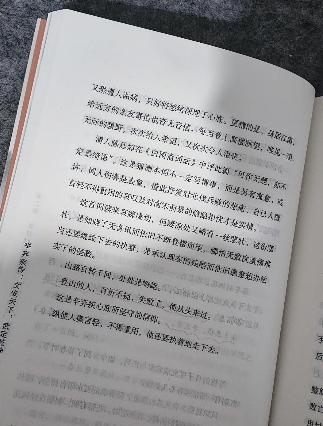 13今天依旧要分享的是辛弃疾的词: 家住江南,又过了、清明寒食。花径里、一番风雨,一番狼籍。红粉暗随流水去,园林渐觉清阴密。算年年、落尽刺桐花,寒无力。 庭院静,空相忆。无说处,闲愁极。怕流莺乳燕,得知消息。尺素如今何处也,彩云依旧无踪迹。谩教人、羞去上层楼,平芜碧。 ——《满江红·暮春》辛弃疾 🍀 北伐失败,又身居江南,给远方的亲友寄信也杳无音信。 每当登上高楼眺望,唯见一望无际的碧野,次次给人希望,又次次令人沮丧。 🍀 清人陈廷焯在《白雨斋词话》中评此篇“可作无题,亦不定是绮语”,这是猜测本词不一定写情事,而是另有寓意。 或许,词人伤春是表象,借此抒发对北伐兵败的悲痛、自己人微言轻不得重用的哀叹及对南宋前景的隐隐担忧才是实情。 🍀 这首词读来哀婉凄切,但凄凉处又略有一丝悲壮。 这份悲壮,是知晓了无音讯而依旧不断登楼而望,哪怕无数次羞愧难当还要继续下去的执着,是承认现实的残酷而依旧愿意想办法实干的坚毅。 🍀 山路百转千回,处处是崎岖。 这位登山的人,百折不挠,失败了,便从头来过。 这是辛弃疾心底所坚守的信仰。 纵使人微言轻,不得重用,他还要执着地走下去。 所以,败了又如何呢?败了就站起来。再败了,那就再站起来。屡败屡战……