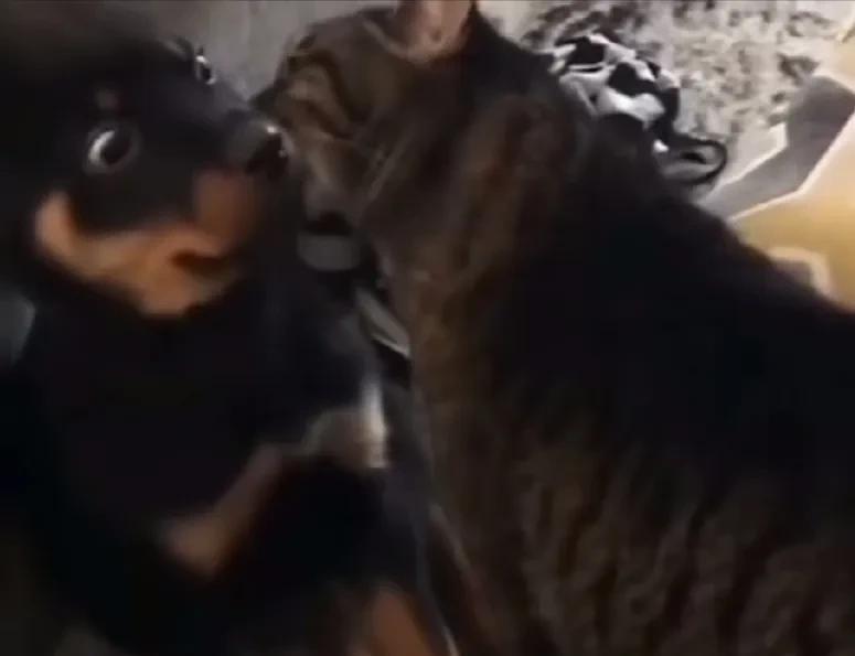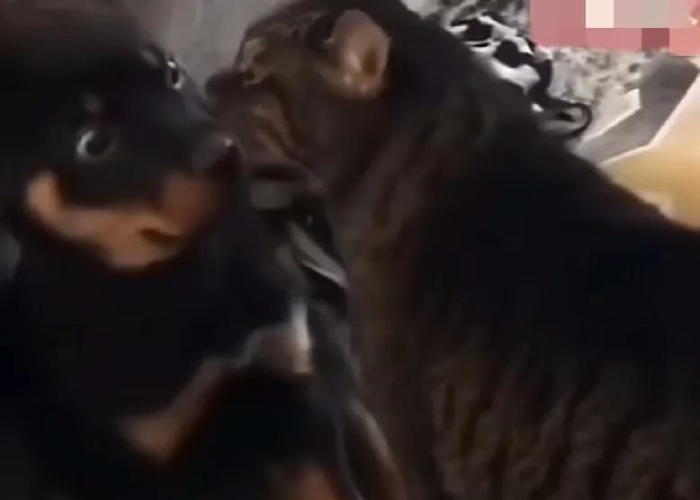 收养了一只流浪狗,家里的狸花猫好像不欢迎它,趴在它耳朵边不知道给它说了什么?反正