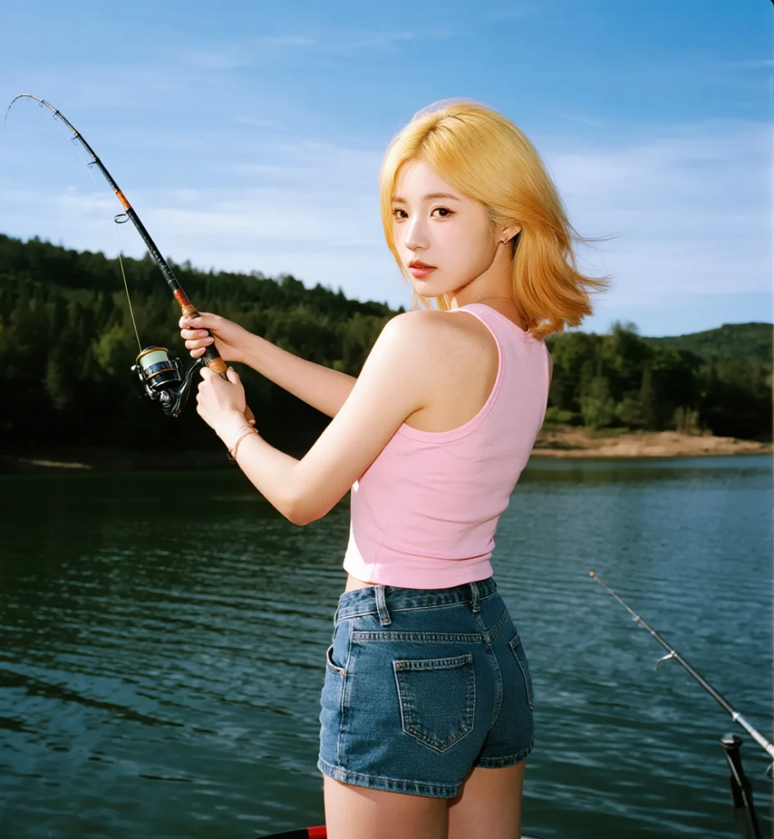 「湖畔诗行:钓竿轻扬间的小姐姐与山水共舞」