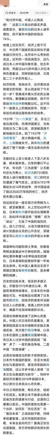日本人为什么讨厌中国人?我觉得这个博主没说到点子上。日本人崇尚武士道精神,你只有征服他,他才愿意俯首称臣,才会用敬仰的眼光去发现你的美好! 如果不能征服他 你有再大的实力,对他付出再大的善意,在他眼里都是“八嘎牙路”,都是不屑一顾。 日本侵略者屠杀中国百姓的历史的仇恨,中国人不需要日本人“给台阶”,日本人无论怎么努力,中国人都不会忘记这段历史。但中国人不会把旧账算到现在的日本人身上,但是中国最不能忍的是日本人故技重演,日本现在和美国的一系列勾结,对台湾,对钓鱼岛的阴谋觊觎才是当代中国人讨厌日本人的重点。大家同意我的看法吗?
