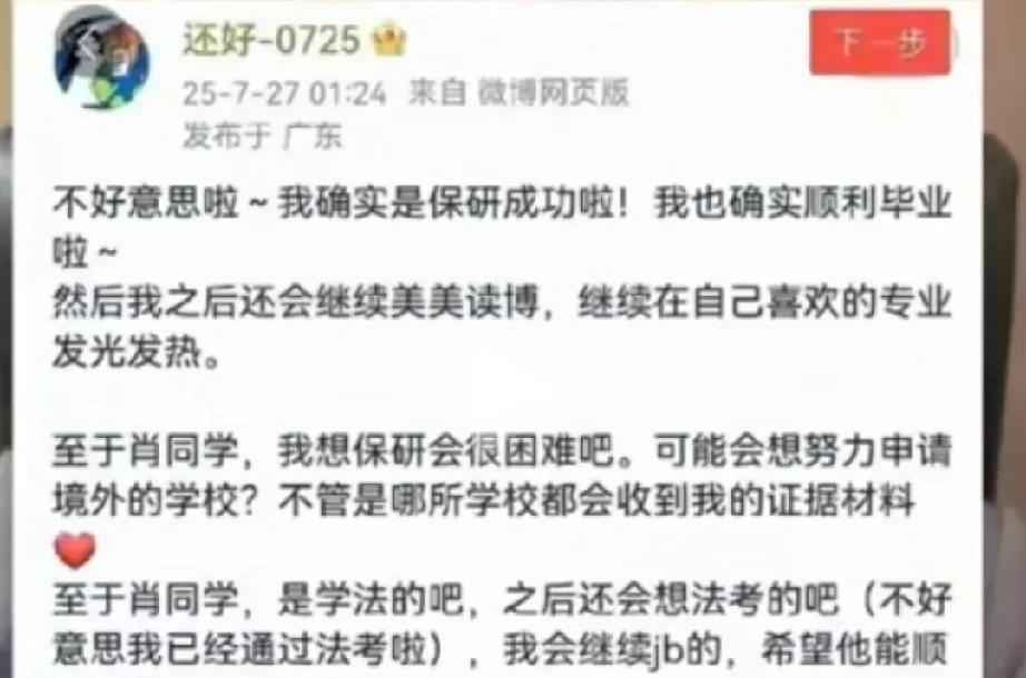 武大杨景媛疯狂报复肖同学终于反噬自己了! 杨景媛如此疯狂的报复肖同学甚至要将他置于死地,她到底图的是什么呢?为啥要这样做呢? 杨景媛拍摄视频状告肖同学性骚扰,我也看了视频从哪一点看到人家是对你性骚扰的?自己挠一下痒痒不可以吗?再说人家也没有裸露隐私部位,更没有对你肢体接触,构不成性骚扰。而且法院也驳回了杨景媛的申诉! 再者,即便是人家有不雅行为,作为同校女生可以过去大胆提醒,甚至警告,或者善意提醒,但她没有,而是在桌子底下对着肖同学拍视频,感觉她的行为很猥琐。 可就是这样简单的一件事,杨景媛却装出一副受害者的可怜样非要置肖同学死地才肯罢休。 这是多大的仇恨啊?至于吗?她不仅向学校举报处分肖同学,还称要让肖同学走到任何地方都会收到举报材料,就连从业都不给留后路,这种断别人后路的行为想想都觉得这女子恐怖。 一个女大学生长得人模人样,又是受高等教育,而且是学法的,这种报复心理太可怕了,这种人如果当了司法部门公务人员那真会把稍微有点问题的人杀个片甲不留永世不得超生。 不过杨景媛的行为终于激起了公愤,论文造假的消息已经满天飞了,不知道这位保研成功的法学博士此刻啥心情。如果最终被定性估计保研也就到此为止了。 不过武大对肖同学的处分一定要慎重,或许该给肖同学一个道歉!