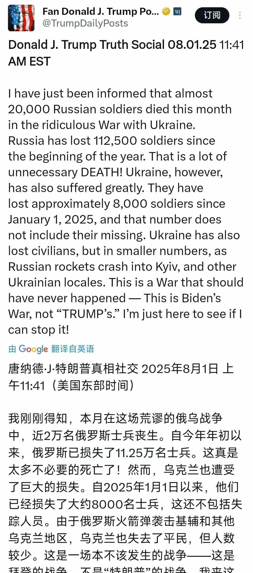 特朗普突然公布俄乌死亡数据,11.25万俄军阵亡背后藏着什么秘密? 特朗普今天(北京时间8月2日)公布了俄乌死亡人数。特朗普写道:“我刚刚得知,本月在这场荒谬的俄乌战争中,近2万名俄罗斯士兵丧生。自今年年初以来,俄罗斯已损失了11.25万名士兵。这真是太多不必要的死亡了!然而,乌克兰也遭受了巨大的损失。自2025年1月1日以来,他们已经损失了大约8000名士兵,这还不包括失踪人员。由于俄罗斯火箭弹袭击基辅和其他乌克兰地区,乌克兰也失去了平民,但人数较少。这是一场本不该发生的战争——这是拜登的战争,不是‘特朗普’的战争。我来这里就是想看看我能不能阻止它!” 数字背后的血与火 11.25万俄军阵亡,8000乌军牺牲,这些冷冰冰的数字背后是一条条鲜活的生命。特朗普的突然爆料,像一颗炸弹扔进了国际舆论场。但问题是,这些数据哪来的?白宫情报?五角大楼内部报告?还是特朗普的“独家消息”?他自己没交代清楚,外界只能猜测。 更耐人寻味的是,乌克兰总参谋部同一天公布的数据显示,俄军总伤亡已突破105万,光7月就损失3.3万人。两边的数字对不上,谁在撒谎?或许,真相藏在中间的某个地方——战争从来都是数字游戏,各方都在用统计手段打心理战。 “拜登的战争”?特朗普的政治算盘 特朗普一句“这是拜登的战争”,直接把锅甩给了前任。但俄乌冲突爆发于2022年,那时候特朗普早下台了。他这么说的潜台词很明显:如果是我在位,普京绝不敢动手。这种论调在保守派选民里很吃香,但对解决战争毫无帮助。 更讽刺的是,特朗普一边骂战争“荒谬”,一边又给普京下最后通牒:8月8日前必须停火,否则加码制裁。可俄罗斯会听吗?普京当天就回怼:“失望源于过高的期待。”显然,莫斯科根本没把威胁当回事。 乌克兰的沉默与俄罗斯的反击 泽连斯基政府至今没回应特朗普的数据,倒是俄媒跳出来说乌军伤亡更惨——TASS声称乌方7个月损失超30万,日均1500人。这种夸张数字连俄军官都承认“让人震惊”,但战场实况呢?俄军仍在强攻波克罗夫斯克,一天发动49次突击,可见战斗有多惨烈。 平民的苦难更触目惊心。联合国报告显示,上半年乌克兰平民死亡激增54%,导弹把远离前线的城市也变成地狱。特朗普说平民死伤“较少”,可对失去亲人的家庭来说,再小的数字都是100%的悲剧。 停战?没那么简单 特朗普总说自己能“阻止战争”,但现实是:俄军还在推进,乌克兰拒绝割地,欧美援助时断时续。所谓和平谈判,不过是双方争取时间的幌子。更残酷的是,即便明天停火,那些消失的年轻生命、破碎的家庭、炸成废墟的城市,又该怎么复原? 这场战争早已不是谁对谁错的问题,而是如何结束这场绞肉机般的消耗。特朗普的爆料或许能短暂吸引眼球,但真正的答案,不在社交媒体上,而在战场外的谈判桌与大国博弈的阴影里。
