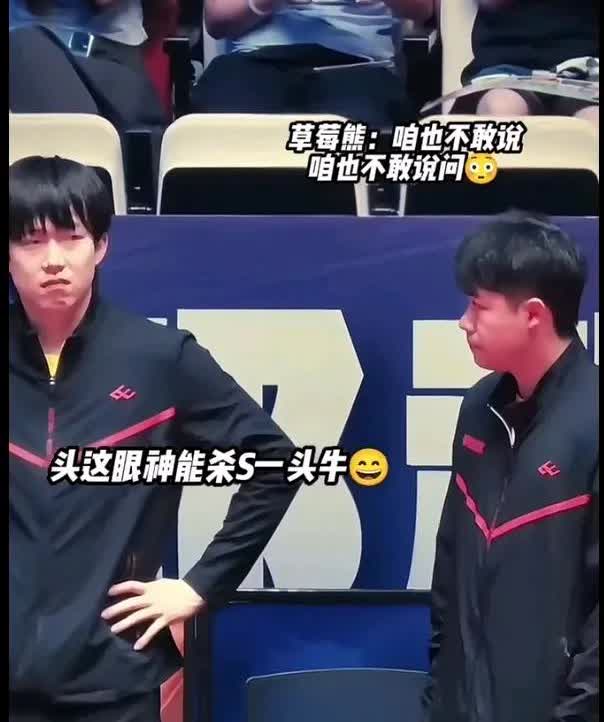 草莓熊:我当时害怕极了!乒超联赛赛场边,草莓熊陪伴头哥坐在场边看比赛,但是不知道谁做了什么,或者哪个球迷喊了什么,惹得头哥不高兴了,他站在哪里眼神凶巴巴的,很显然是生气了,草莓熊看着头哥:我当时害怕极了,咱也不敢说 咱也不敢问。