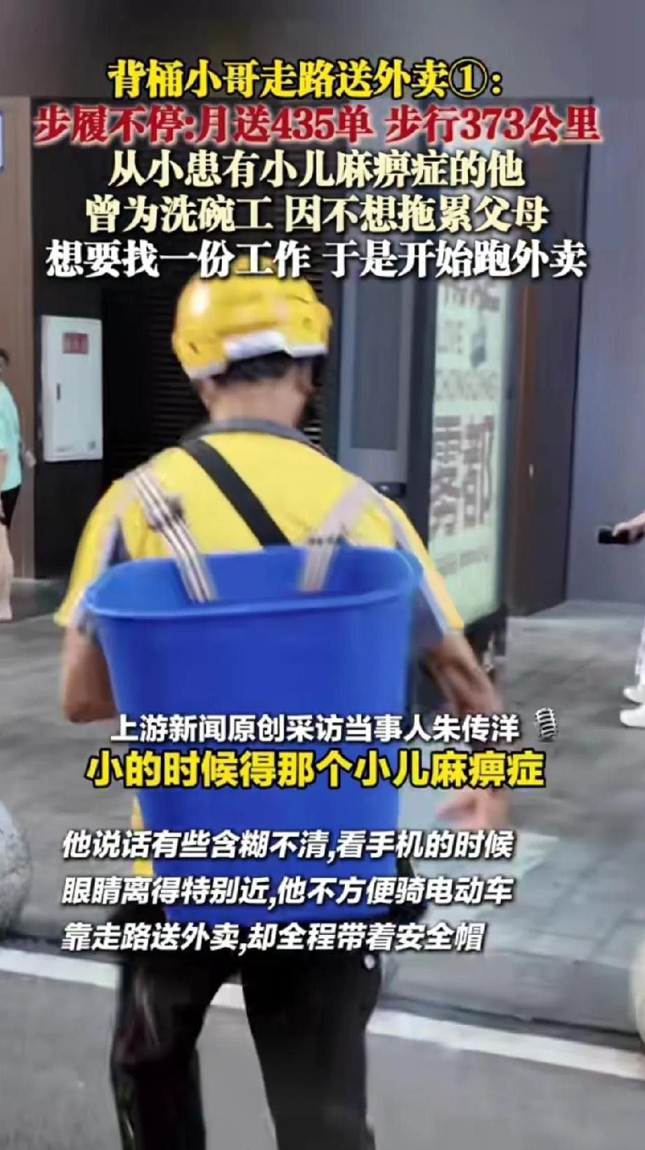 别人送外卖,骑的是电摩,拼的是速度,他却凭借双腿与别人抢单跑外卖。 患有小儿麻痹症的重庆“背桶小桶”,始终坚持脚步不停,工作不休,竟然月送外卖435单,步行373公里,其惊人的“创举”迅速成为了大家热议的话题。 这几天,重庆的温度高达40多度,当记者对他进行采访时,发现他自幼患有小儿麻痹症,语言表达能力也有些含糊不清,甚至看订单时眼睛也要离手机很近,他名叫朱传洋,今年35岁。 他向记者表示,他以前是个洗碗工,那些大妈和阿姨都嫌他手脚慢,于是他就想换份工作,也不想拖累父母,便决定跑外卖。但由于自己患有小儿麻痹症,不能骑电动车,所以只能背着塑料桶徒步前行。 因为这段时间天气太热,有些单子其他外卖员不愿意接,他的订单就相对多一些,再加上他熟悉周边地形,有些人也比较理解他,所以他跑外卖并没有遇到太多的阻碍,只是走路比较吃力些罢了。 一份劳动,一份收获,身残志坚的他通世克服身体障碍努力工作自强不息的精神不但鼓舞和激励了大家,还让无数网友感动落泪。 #头号创作者激励计划#