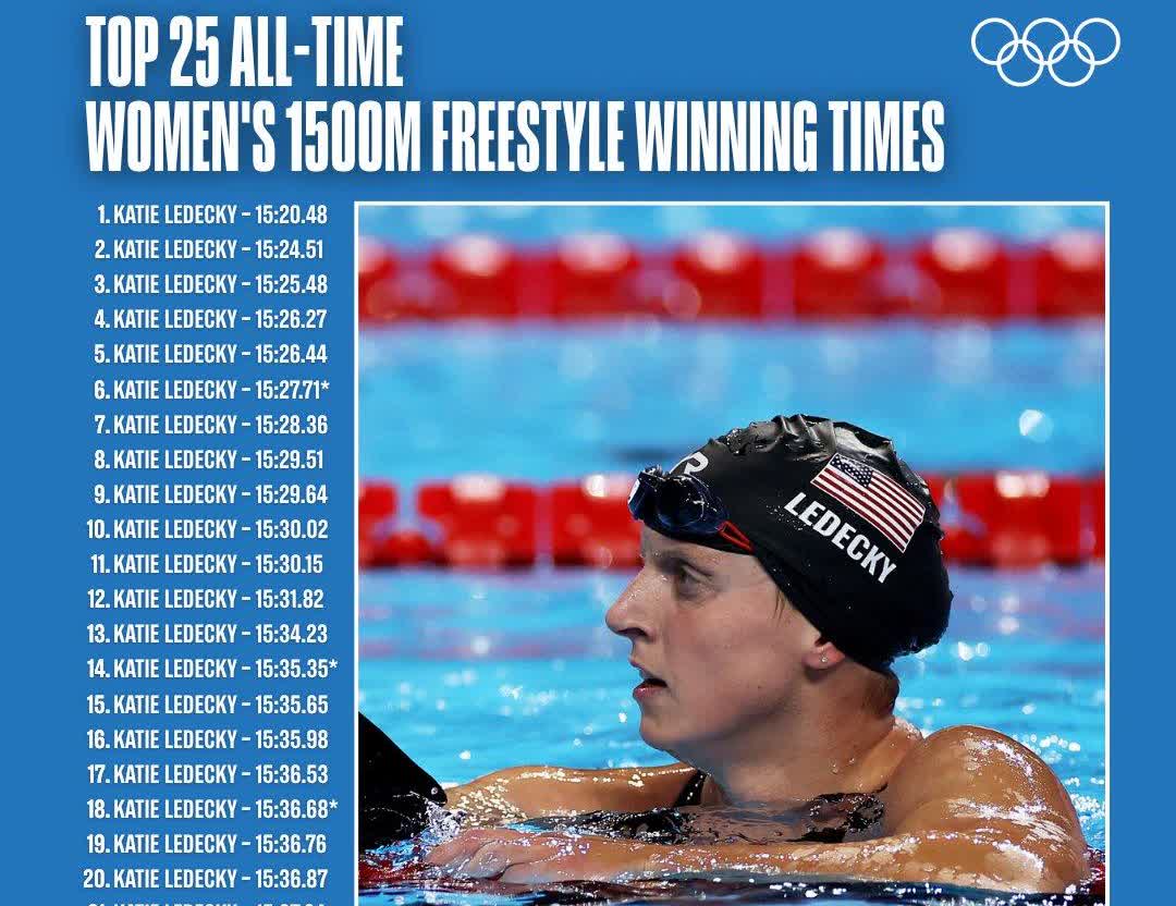 不得不服,莱德基就是历史上最伟大的女游泳运动员! 800米自由泳历史前十的成绩中,莱德基独占七席,1500米自由泳更为夸张,15年不败!前25名历史最好成绩,全是莱德基一个人的名字。这不仅仅是胜利,而是对长距离游泳项目的绝对统治权! 真的是不得不感叹,只要有莱德基在,其他选手就只能争第二名。李冰洁和加拿大的麦金托什已经很强了,但身处莱德基同一时代,只能怪生不逢时。 莱德基的名字,已经和长距离自由泳划上了等号。毫无疑问,她就是泳池中的传奇!
