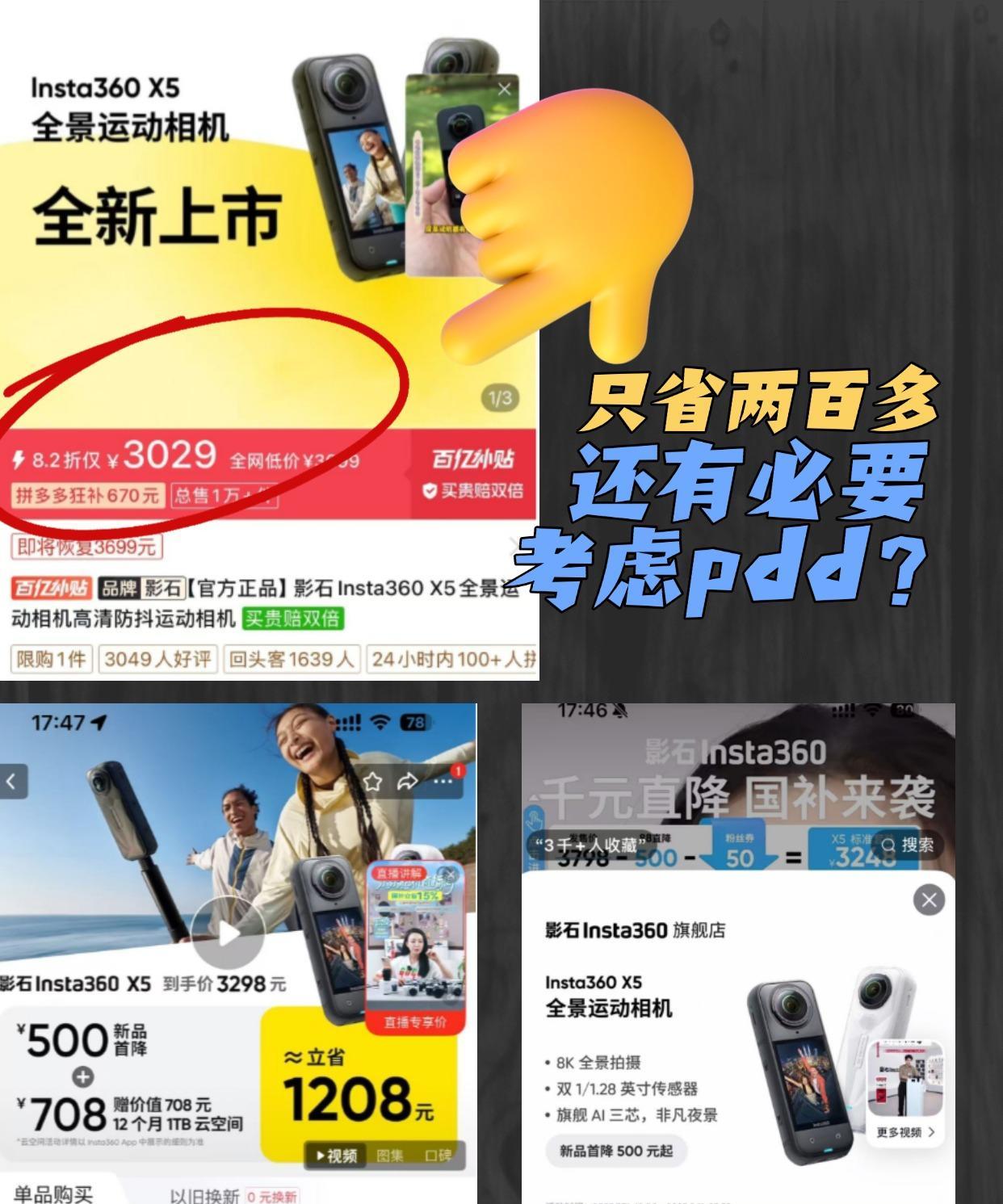 去哪买insta360 X5比较划算靠谱啊!! 想着月底出去玩买个全景相机玩玩,正好赶上了影石Insta 360 X5降价了,看了一眼,功能都挺全的,外观也比较小巧,很适合出去玩的带,但要下单的时候发现pdd比别的平台价格更低,话说,大家觉得有必要省个270,去pdd下单吗?