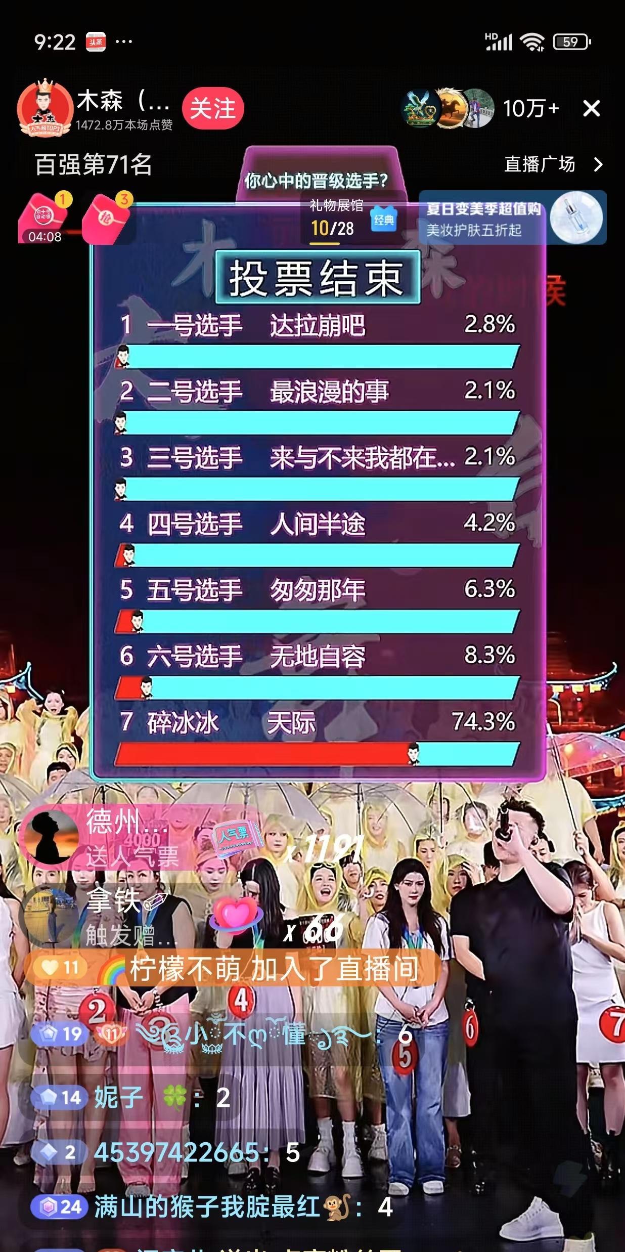 木森大舞台今晚在大雨中进行唱歌比赛,艺人们穿着雨衣坚持站队,精神可佳。参加比赛六位选手,第一关的四千组比赛,守擂的艺人碎冰冰一首《天际》,团灭了六位选手,也是木森大舞台少见的情况,艺人碎冰冰直接升为八千组。