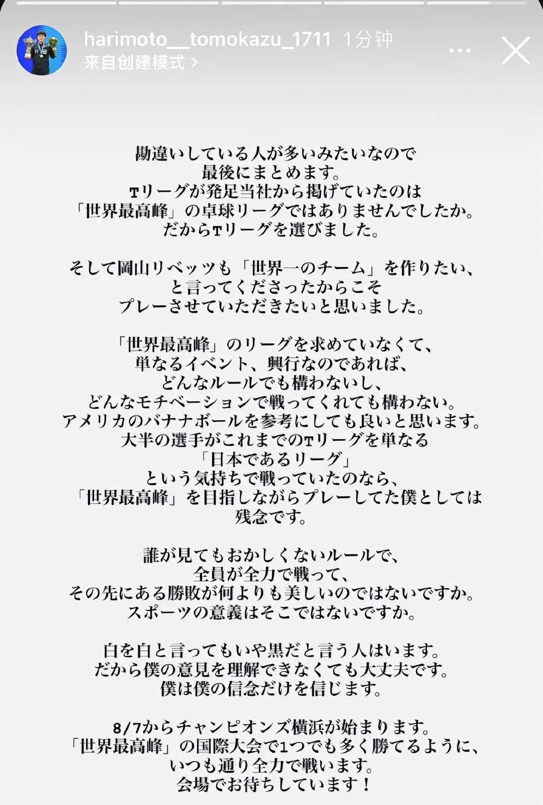 #头号创作者激励计划#张本智和:因为误解的人好像很多,所以最后总结一下。 T联赛成立提出的不是“世界最高峰”的乒乓球联赛吗。所以我选择了T联赛。 而且冈山Rivets也说想创造“世界第一的队伍”,所以我想参加比赛。 如果不追求“世界最高峰”的联赛,只是单纯的活动、表演赛的话,什么规则都可以,用什么样的动机战斗都可以。我觉得可以参考美国的“香蕉球”模式。大部分选手如果以单纯的“日本联赛”的心情进行联赛的话,对于以“世界最高峰”为目标进行比赛的我来说是很遗憾的。 这是一条谁看都不奇怪的规则,然后所有人都全力以赴,在那之后的胜负比什么都美丽。体育的意义不就是那里吗。 即使我说白色是白色,也会有人坚持认为那是黑色。 所以,即使无法理解我的观点也没关系。 我只相信自己的信念。 从8月7日开始横滨冠军赛。为了在“世界最高峰”的国际大会上多赢一场,我会和往常一样全力战斗。期待在会场与大家相见!(机翻) 2025.8.5