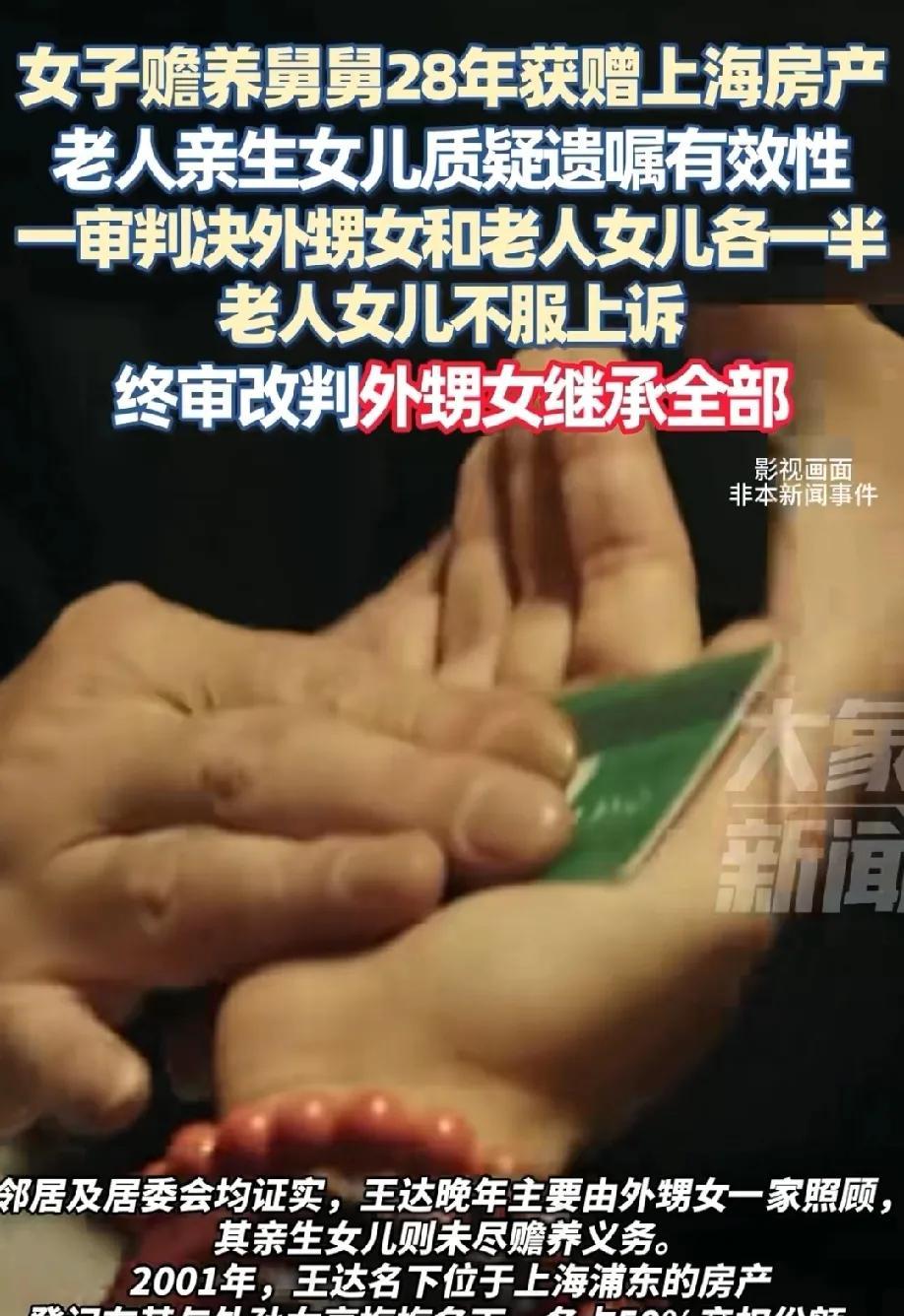上海,女儿不管父亲的死活,只有外甥女独自赡养老人28年。老人感动之余,立下遗嘱,把自己的遗产留给外甥女。不料,老人尸骨未寒,女儿就把外甥女告上法庭,要求继承老人的遗产。经过一审和二审,法院给出不同的判决! 在上海浦东,一套房子把一家人搅得鸡犬不宁。 这事得从二十多年前说起,王达老爷子早年就没了老伴,一个人又当爹又当妈,把独生女王小晓拉扯大。 本以为女儿出息了能陪在身边,没成想王小晓后来去了国外定居,常年不回来,老爷子身边就冷清清的。 也是赶巧,王达的外甥女周小冬那会儿想在上海打拼,就投奔了舅舅。 王达一看外甥女来了,打心眼儿里高兴,不光让她在自己生意上搭把手,还让没地方住的小冬一家搬来同住。 这一住,就是二十八年。 这二十八年里,小冬两口子对王达是真没话说。 生意上帮着打理得井井有条,家里更是照顾得无微不至。 老爷子年纪大了,行动不方便,吃喝拉撒全靠小冬伺候,闷得慌了,小冬就扶着他出门遛弯儿,生了病,也是小冬端水喂药,守在床边不离左右。 街坊邻居都看在眼里,都说王达这外甥女比亲闺女还亲。 可再看看王小晓,二十八年里回来看过老爷子几趟?屈指可数。 老爷子生病住院,她人影儿都见不着,电话里说不了三句就挂。 王达心里头不是滋味,跟邻居念叨过好几回:"我这闺女啊,不管我喽,也不想跟我住。" 话里的委屈,谁都听得出来。 房子的事儿也得说清楚。 2001年的时候,王达把房子登记在自己和外孙女名下,爷孙俩各占一半。 那年他还立了份遗嘱,想把自己那一半将来分给外孙女和小冬,一人一半。 可后来看着女儿越来越冷淡,小冬又一天比一天尽心,到2009年,老爷子改了主意,干脆去公证处立了新遗嘱,把自己名下那50%的房产,全留给外甥女周小冬。 他心里明镜似的,自己走了,王小晓说不定就得把小冬一家子赶出去,总得给人家留个安身的地方。 2020年,王达老爷子还是走了。 果不其然,一直不露面的王小晓带着外孙女回来了,一进门就想把周小冬一家撵出去,说这房子该是她的。 小冬拿出去年那份公证遗嘱,王小晓不认,说这遗嘱不算数,俩人为这事儿闹到了法院。 一审的时候,王小晓不依不饶,说没证据证明老爷子改了遗嘱,还说周小冬没明说要这房子。 法院最后判了个各占一半,小冬不服,王小晓也觉得亏,俩人都上诉了。 到了二审,情况就不一样了。 小冬这边拿出了证据,老爷子刚走,她丈夫就把2009年那份遗嘱发给了王小晓,亲戚们也能作证,小冬早就跟大伙儿说过舅舅把房子留给她的事。 法官说了,接受遗嘱不一定非得写书面材料,口头说过、有实际行动都行。 再说了,公证遗嘱白纸黑字,还有啥可争的?最后判下来,王达名下那50%的房产,全归周小冬。 说句实在话,这王小晓真是让人看不过去。 二十八年啊,亲爹一个人孤零零的,她不管不问,等老人走了倒想起争房子了? 哪有这样的道理?血缘再亲,也经不住这么寒心不是? 周小冬伺候老人二十八年,端屎端尿没含糊过,老爷子自愿把房子留给她,合情合理,于法于情都说得通。 再说那外孙女,自己本来就占着房子的一半,居然还跟着妈去告周小冬,最后竹篮打水一场空,也是自找的。 法律讲的是证据,是道理,不是光看血缘。 你对老人尽了孝,该你的跑不了,你要是不管不顾,就想空手套白狼,那肯定行不通。 这案子说到底,就是人心换人心。 王达老爷子心里有数,谁对他好,他就向着谁。 法院最后这么判,既是维护了遗嘱的效力,也是给那些真心付出的人一个公道。 像王小晓这样,只想占便宜不想尽义务,最后落得这个结果,一点都不冤。 #MCN双量进阶计划#