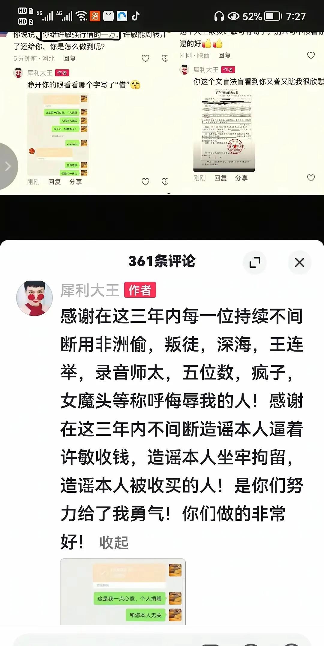 犀利大王是真心感谢这些网友吗?原来犀利大王有这么多称号,好多我都不知道,收集这些也算有心了,给人家起什么外号呢? 己所不欲勿施于人,犀利大王被这些外号烦心,不知道犀利大王是否也公开给别人起过外号?给杜女士?给许敏?网络是有记忆的,放到自己身上受不了,当初你不也放到过别人身上吗? 10000元的事情都不是秘密了,你这10000元可没有少折腾流量,只是,有多少人相信你?说不清了就说自己抑郁,抑郁什么?你不也说了别人吗?没少说杜女士吧?如今拐头又说许女士,你也不是真正义,不过是为流量而已,杜女士把你看得比较清楚。 “破釜沉舟”?犀利大王你根本就没资格用这词,你有啥可拼的?你可以用“垂死挣扎,鱼死网破”这类词来形容自己,那个词你用不合适。