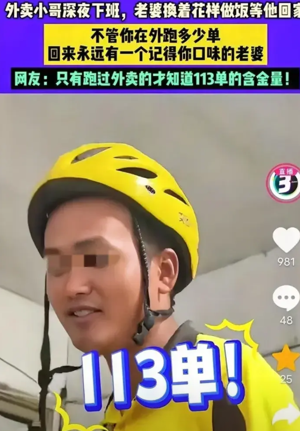 媳妇问,今天跑了几单?外卖员说跑了113单,有点少。媳妇笑着说,还少呢,你就是我心目中的战神,媳妇说完就去做饭了。