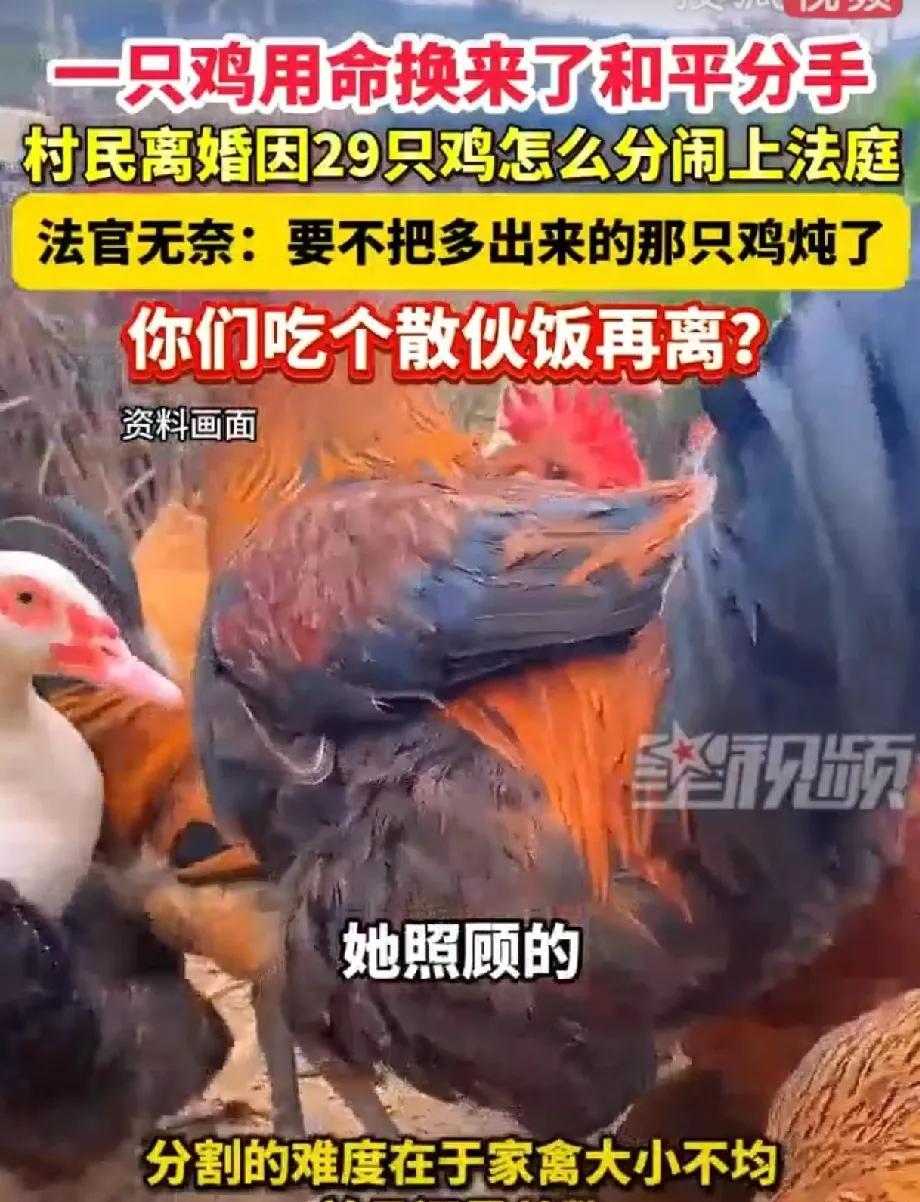 大千世界,无奇不有,离婚为29只鸡分配不公闹上了法庭,大家说夫妻之间打这种官司笑不笑人! 这是一个视频里讲述的故事,一个村民两口子闹离婚,啥都好说,就29只鸡的分配发生矛盾,双方互不相让,最终闹上法庭。 争议就两点,一是鸡的香量不一,有的重些有的轻些。二是29只是奇数,各14只又剩一只,这只给谁都不干。 二人你说鸡是我喂得多,我说鸡是我照顾得多,都说多这一只该归自已,从而没一方要让步。 法官审理后见两人互不相让,最后建议干脆杀一只炖了大家共同吃一顿离婚散火饭。 真的太奇葩,夫妻一场,为一只鸡打官司,说真的,要是我是当事人,这鸡我一只都不会要。 夫妻做到这种分上,或遇上这种夫妻,不离婚才怪。 #头号创作者激励计划#