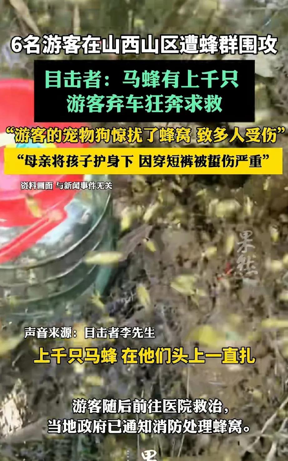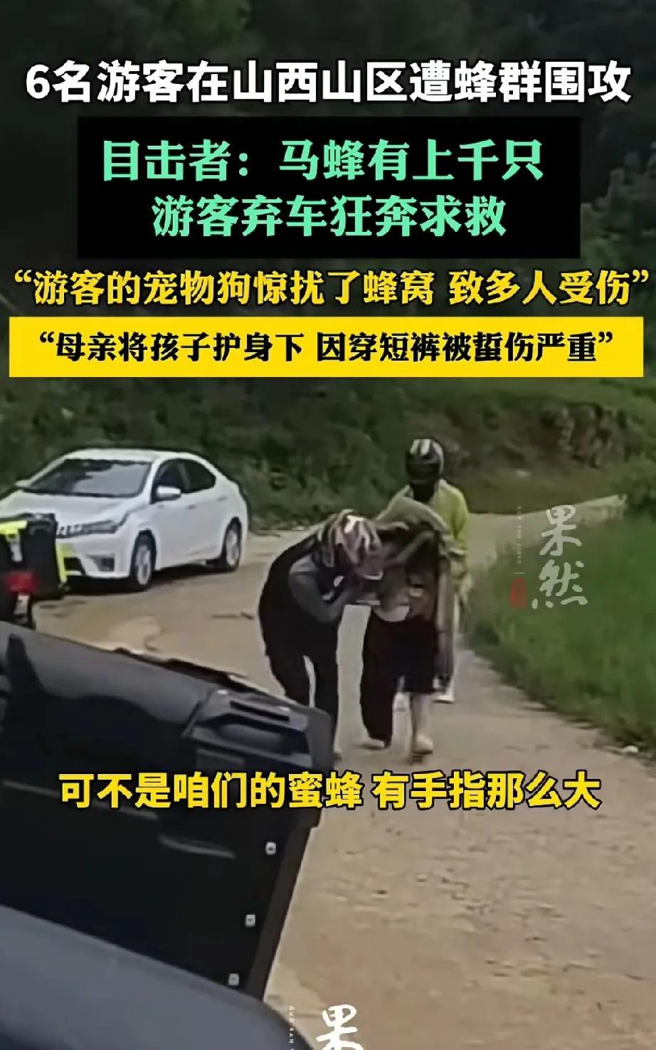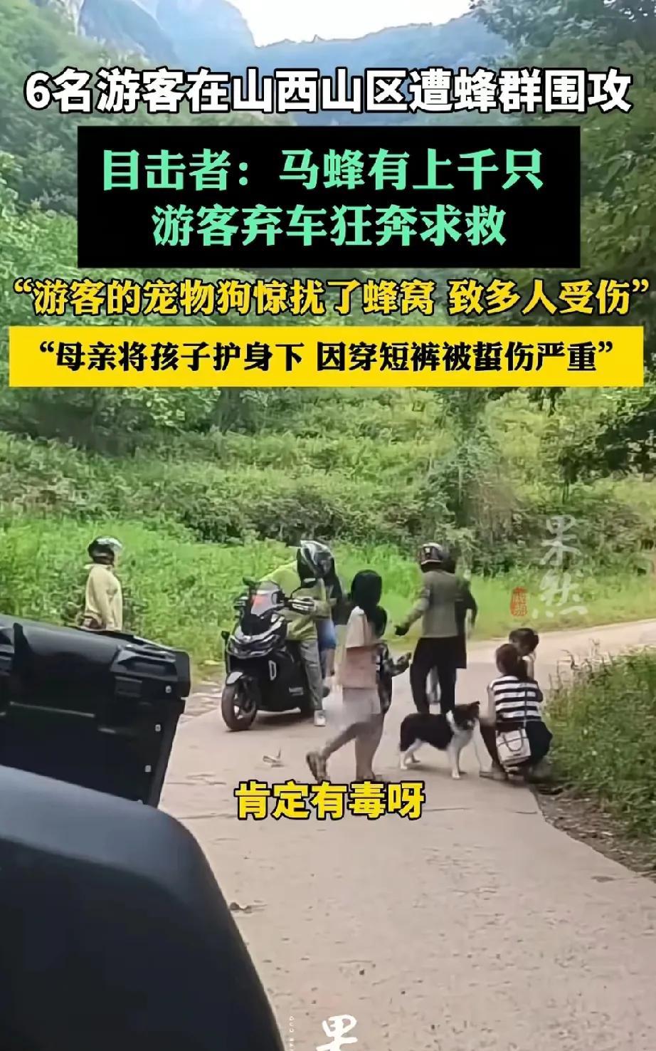 太吓人了,山西6名游客因宠物狗惊扰马蜂窝,上千只马蜂倾巢而出,导致多人被蜇伤。