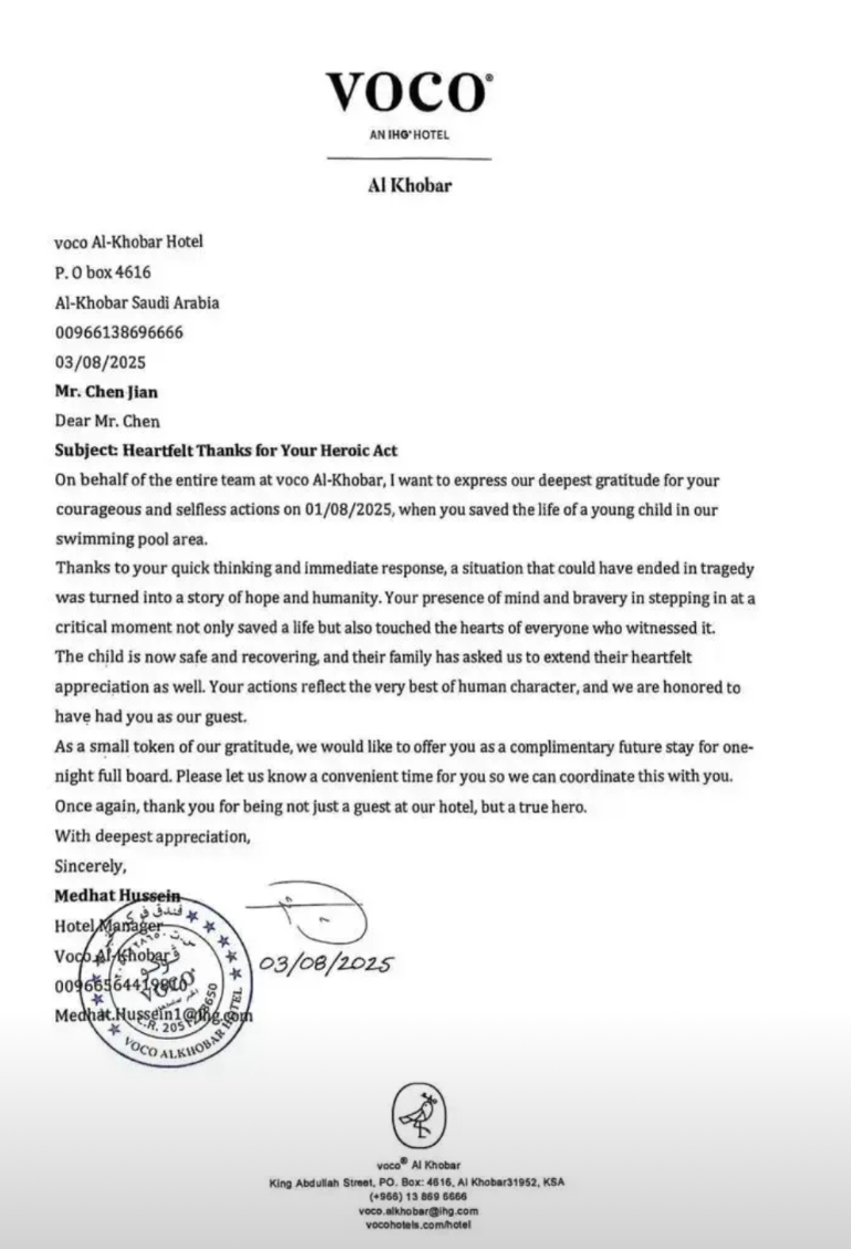 8月1日清晨7点多,沙特阿尔霍巴尔市一家高档酒店,两名阿拉伯女子到健身房大喊大叫。来自中国的老板陈健(来自宜兴,到沙特考察市场7天)意识到情况不对,跟她们比划手势,她们将他拉向隔壁泳池,并指向水面。 陈健心想:“坏了,有人溺水了!” 泳池水很深,肉眼完全无法看清水下情况。”陈健纵身跃入,发现水底有一名男孩已失去意识。 但多次尝试都无法托起男孩,直到第六次下潜,终于救出男孩。此时,男孩已停止呼吸。陈健对其实施心肺复苏……十分钟后,这名13岁男孩恢复微弱呼吸[努力] 男孩父亲赶到酒店代表家族感谢他,酒店致感谢信,并赠予陈先生免单待遇。中国人的义举在沙特传为佳话。 在接受采访时,陈先生表示:“这不过是本能反应,其实每一个中国人都会做出同样的选择。”