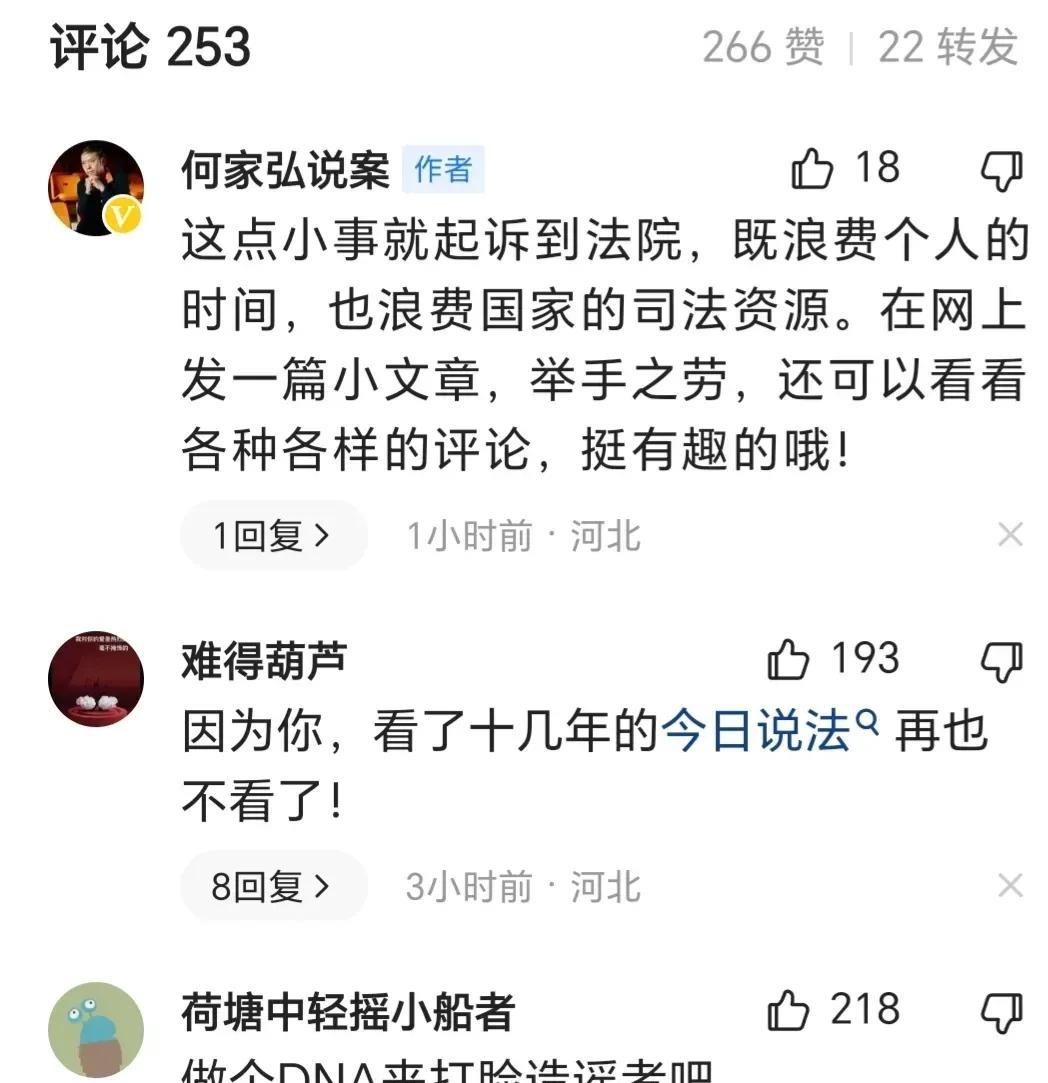何家弘不打算起诉造谣他的博主,何教授还是比较有心胸的,尽管他认为有网友造谣他有个河南的小姨子,但是,为了不浪费国家司法资源,何教授不会起诉这些评论过激的网友,不得不说,教授的还是比普通人心胸宽广,否则,何教授群告下来也是一件麻烦事,说不定也都是1000元了事。 何教授认为起诉网友是浪费自己的时间,他好像也不是很在乎金钱成本,问题的关键何家弘不想浪费司法资源,他觉得发篇文章说一说就够了,10分钟的事情。 最重要的是何教授想通过这篇文章看看网友们的反应,看看大家对他的评论,他认为这是比较有趣的事情,教授的站位就是高,换个角度看网友的恶评,彰显的是一个人素养,如果几句恶评都容忍不下,那还称什么有影响力的名人?通过浪费国家司法资源诉讼,更抬不高自己的身价,大家说是不是?