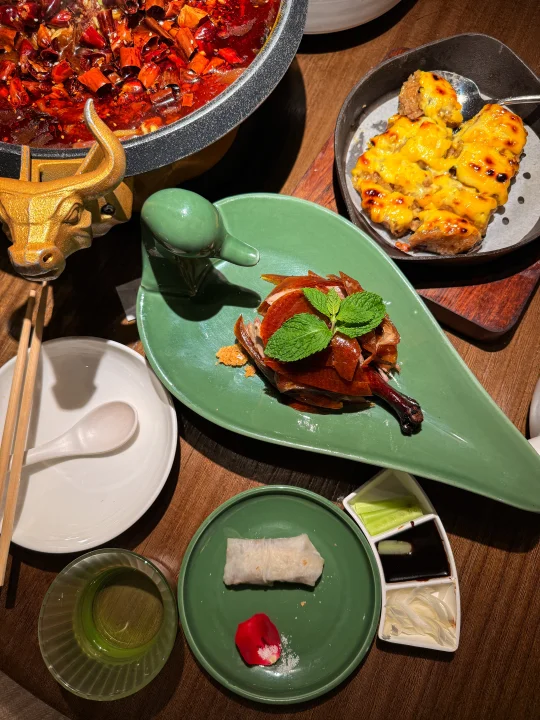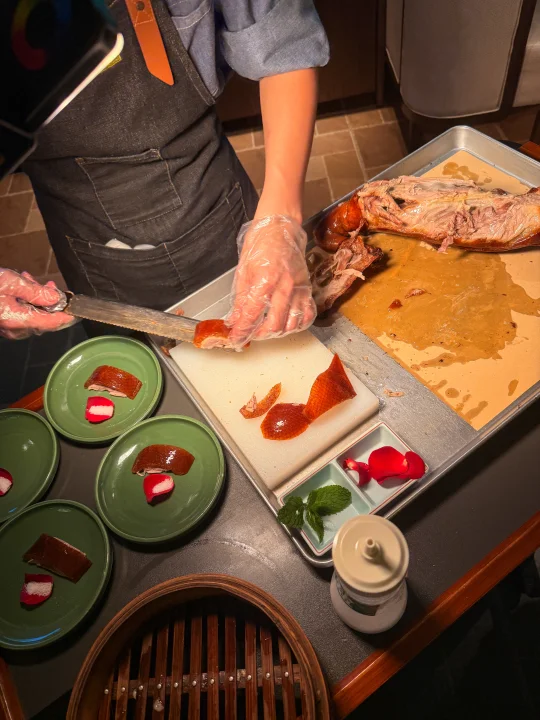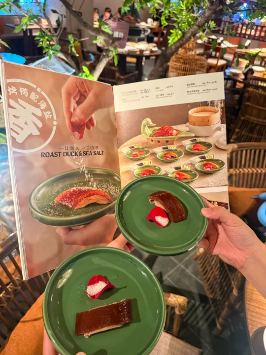 玫瑰海盐烤鸭有点惊艳了🧑🍳师傅现场片鸭动作麻利,皮是皮、肉是肉、骨是骨,蘸上一点玫瑰海盐🥀咸香中带着淡淡的玫瑰香,完美中和了烤鸭的油腻🦆味道不输给北京的那些老牌烤鸭店