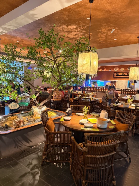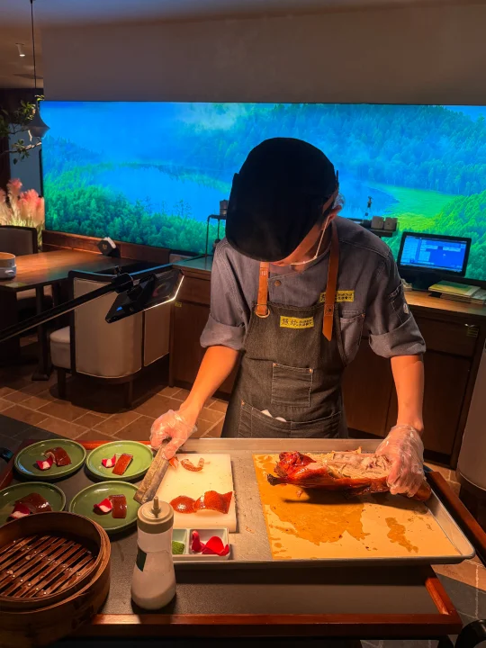 原木桌配着藤编装饰🪑随处可见的绿植,感觉呼吸里都带着点草木的清新感🍃完全没有传统烤鸭店的厚重感🌳像在山野里野餐自然得让人放松~