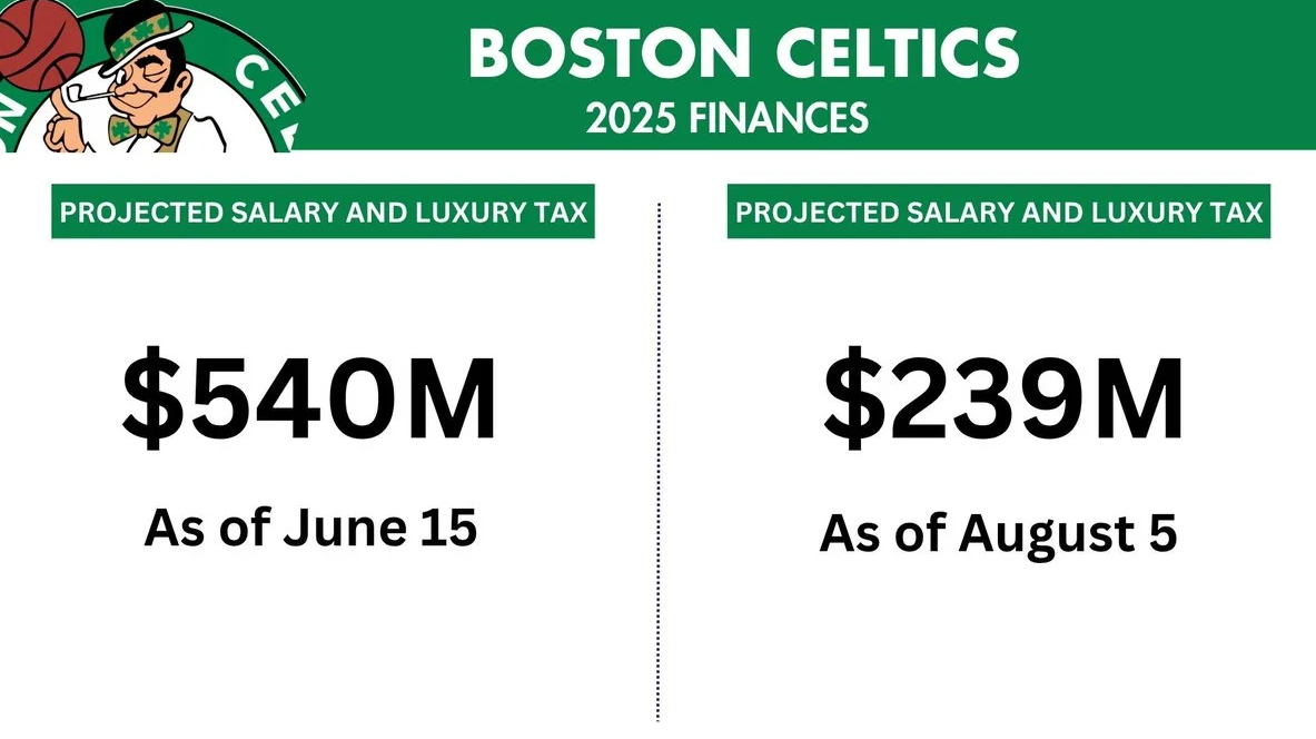 根据之前的报道,凯尔特人把乔治-尼昂送去了爵士,并签下了克里斯-布歇。 随后,Bobby Marks更新X,晒出一张图片与球迷分享。 如图所示,凯尔特人的球员薪资+奢侈税从6月15日的5.4亿美元,下降到现在的2.39亿美元
