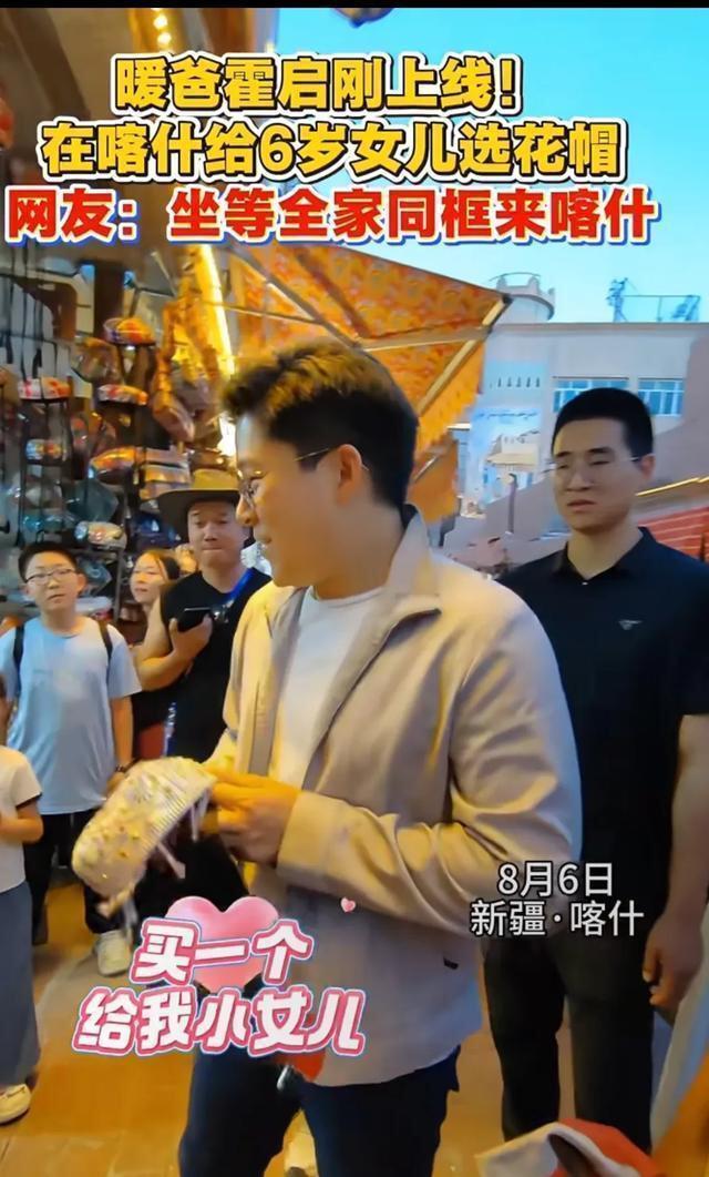 8月6日,霍启刚第一次踏上新疆的土地,一到喀什,直奔热闹的本地集市,不少路人认出了他,都热情打招呼,他总是笑呵呵回应,特别亲切接地气,不愧是郭晶晶老公。走到卖女孩帽子的摊位停下脚步,满脸喜欢得给女儿挑选花帽,这也太会宠娃了,是个妥妥的好爸爸