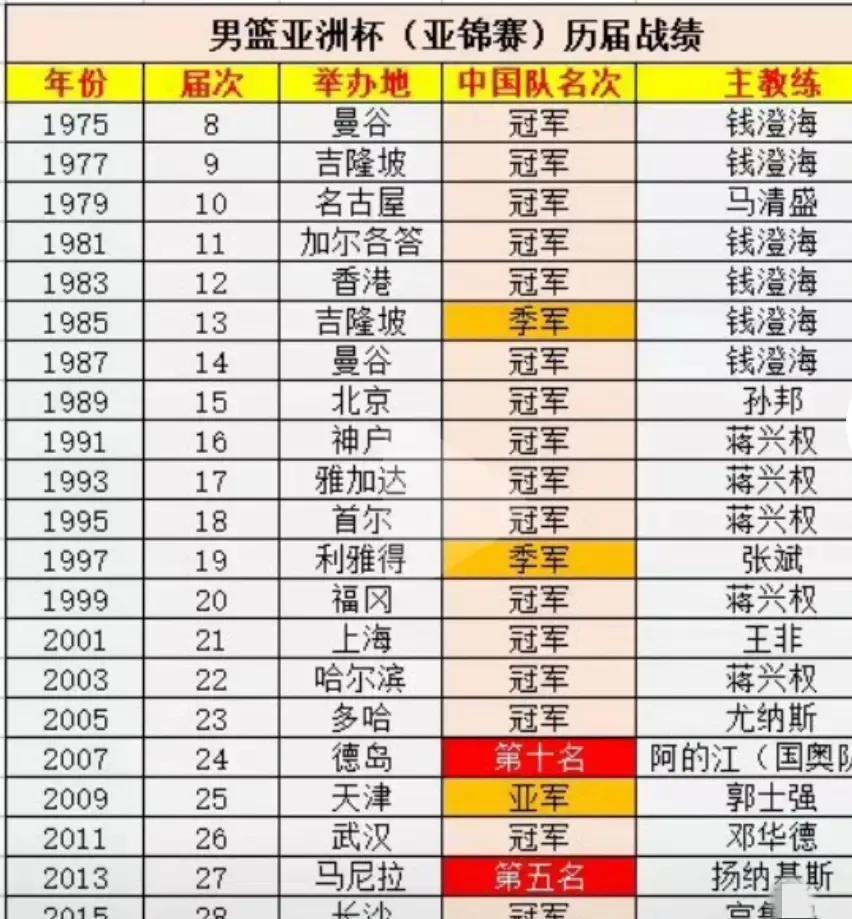 10年未夺冠!中国男篮亚洲杯历年战绩: 1.截至目前,中国男篮共参加23次亚洲杯,其中16次拿下冠军,1次亚洲,2次季军; 2.除去2007派二队参加,上届比赛创造最差战绩,仅仅进入八强; 3.中国男篮已经10年未夺冠,甚至是最近两届都没有进入四强; 4.1999-2005,巅峰期曾连续四次夺冠,统治亚洲! 5.曾经吧奥运8强,上届亚洲杯也仅仅是亚洲8强;