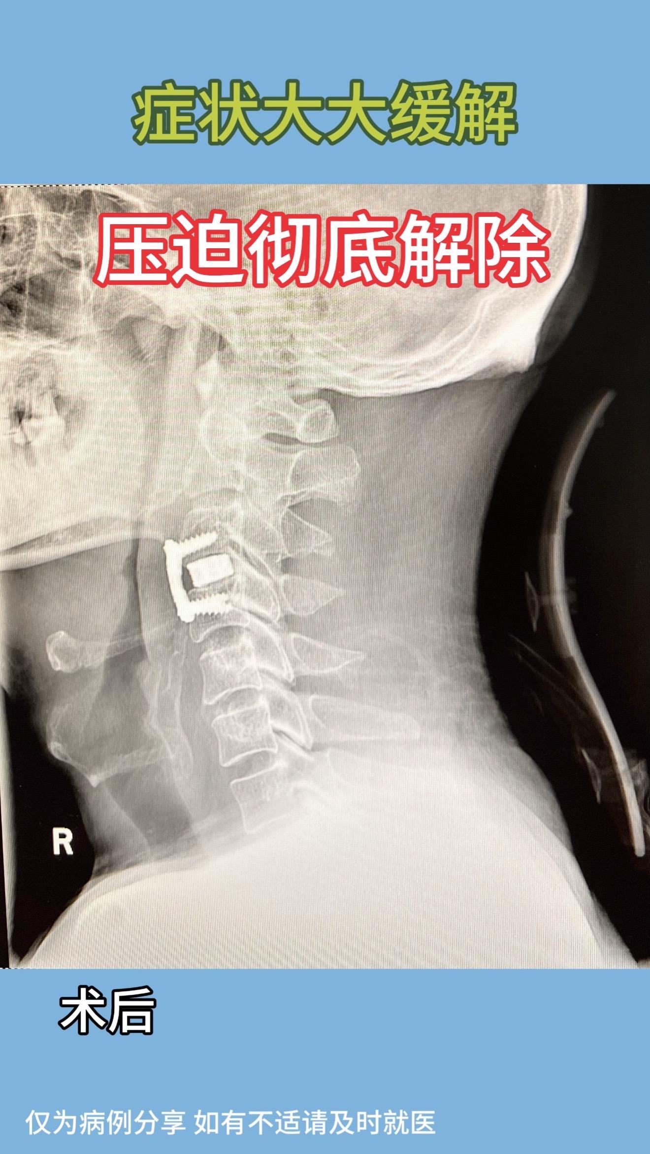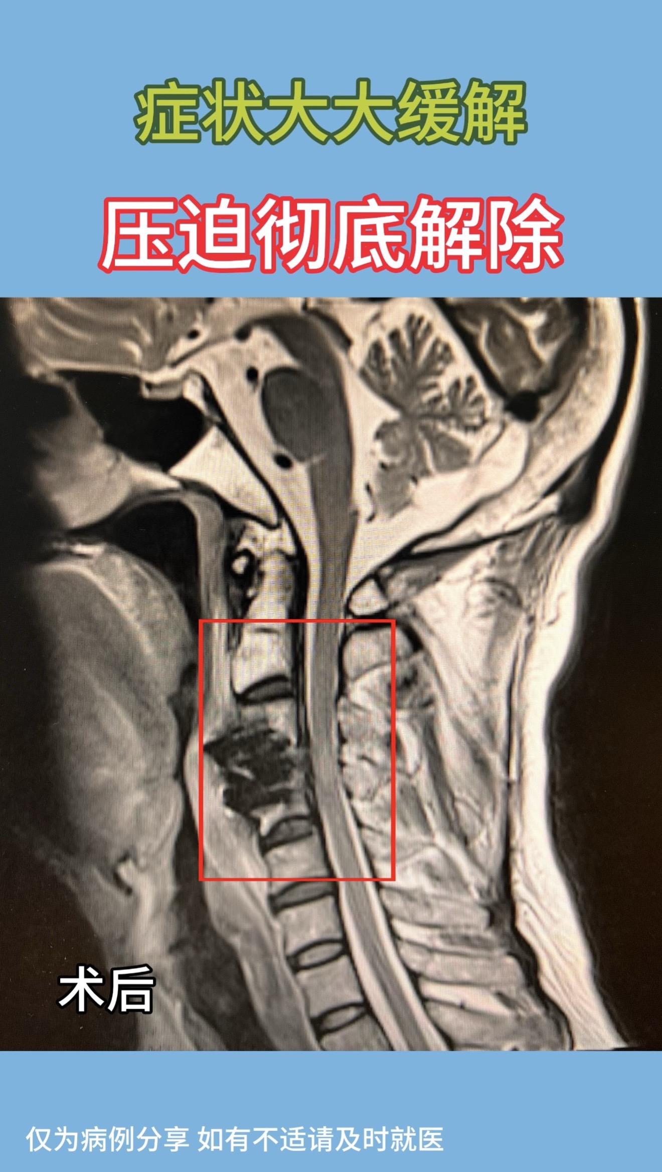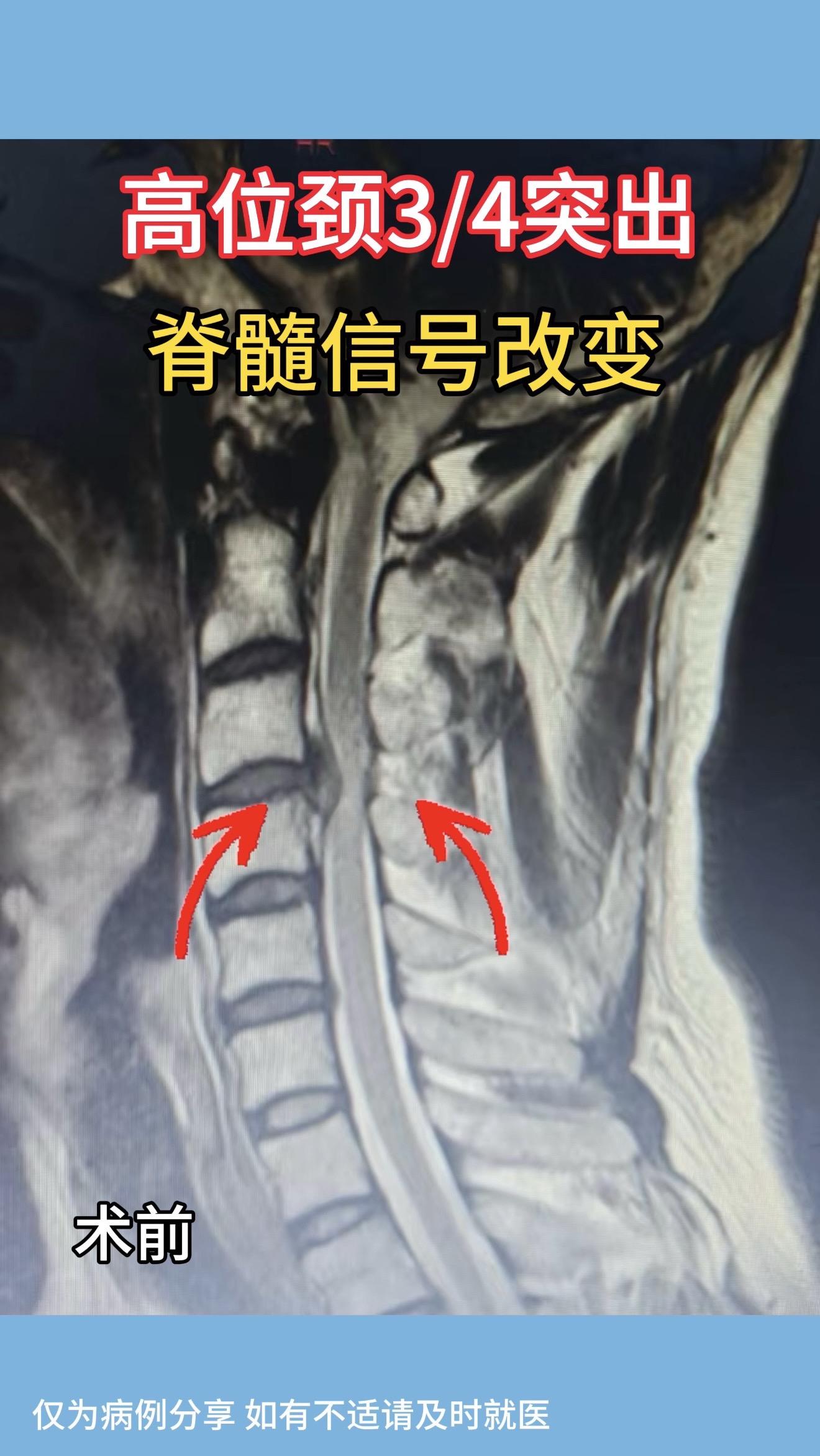 40多岁男性,右手无力、肌肉萎缩半年,右手持筷不能,只能用勺子吃饭。左手无力,症状较右侧稍轻。磁共振示高位颈3/4突出,脊髓信号改变。术后症状大大缓解,术后磁共振示压迫解除彻底。