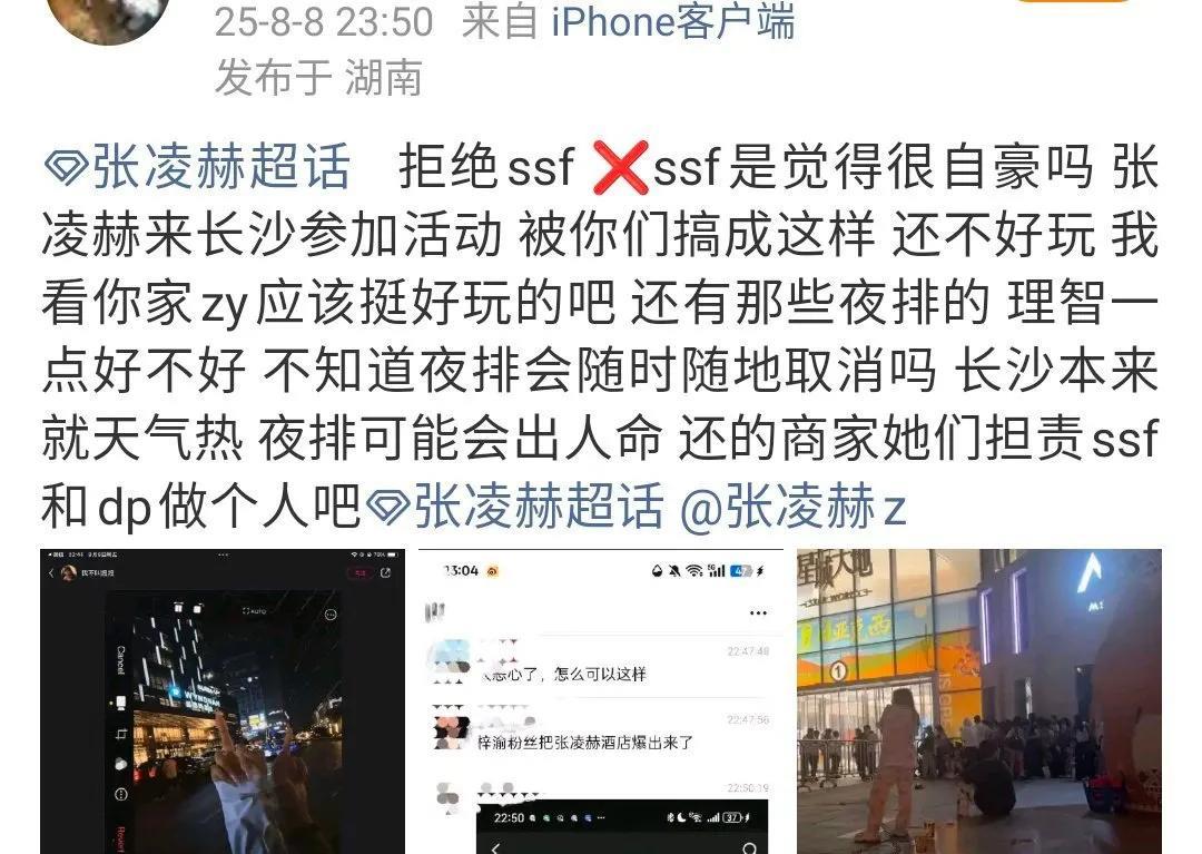 张凌赫长沙活动取消,疯狂追星乱象再引关注 近日,张凌赫现身长沙,原本一场令粉丝们满心期待的线下活动,却以令人遗憾的方式收场。活动因连夜排队人数过多,安全隐患剧增,最终不得不取消,这一消息令众多粉丝大失所望。而更令人咋舌的是,活动取消背后,是私生饭(ss)、代拍(dp)以及部分梓渝粉丝一系列疯狂且毫无边界感的行为。 活动前夕,就有不少粉丝在场地外彻夜排队,现场秩序逐渐失控。这些夜排的粉丝们怀着对偶像的狂热,全然不顾场地管理方的多次警告,甚至有愈演愈烈之势,最终导致活动因安全问题不得不紧急取消。 而与此同时,张凌赫的酒店地址被ss、dp以及梓渝粉丝曝光到网上,大批人员前往酒店围堵。酒店门口瞬间被围得水泄不通,严重影响了酒店的正常运营秩序,也极大地干扰了张凌赫的正常休息与出行。私生饭们疯狂地追逐、拍照,全然不顾及张凌赫的个人感受和隐私,代拍们更是为了获取所谓的“独家照片”,在一旁推搡、争抢有利位置,场面一度混乱不堪。 张凌赫并非首次遭遇此类疯狂追星的困扰。此前,在其他活动中,也有私生饭和代拍的身影,他们的行为不仅影响了张凌赫的工作,还对他的生活造成了诸多不便 。在粉丝群体中,大家对于这种过度追星的行为也是深感无奈与不满。许多理智的粉丝纷纷发声,呼吁大家能够尊重张凌赫的个人生活,以更加理性和文明的方式去支持偶像。 此次事件引发了网友们的广泛讨论。有人认为,粉丝喜欢偶像无可厚非,但应该守住底线,尊重他人的隐私和正常生活秩序;也有人指责那些疯狂追星的人,为了满足自己的私欲,不顾及他人感受,给偶像和公共秩序都带来了不良影响。 追星本应是一件充满正能量的事情,通过欣赏偶像的作品和才华,激励自己不断进步。然而,如今部分粉丝的疯狂行为却偏离了追星的初衷,让追星变了味。希望粉丝们能够回归理性,给予偶像足够的尊重和空间,共同营造一个健康、有序的追星环境 。