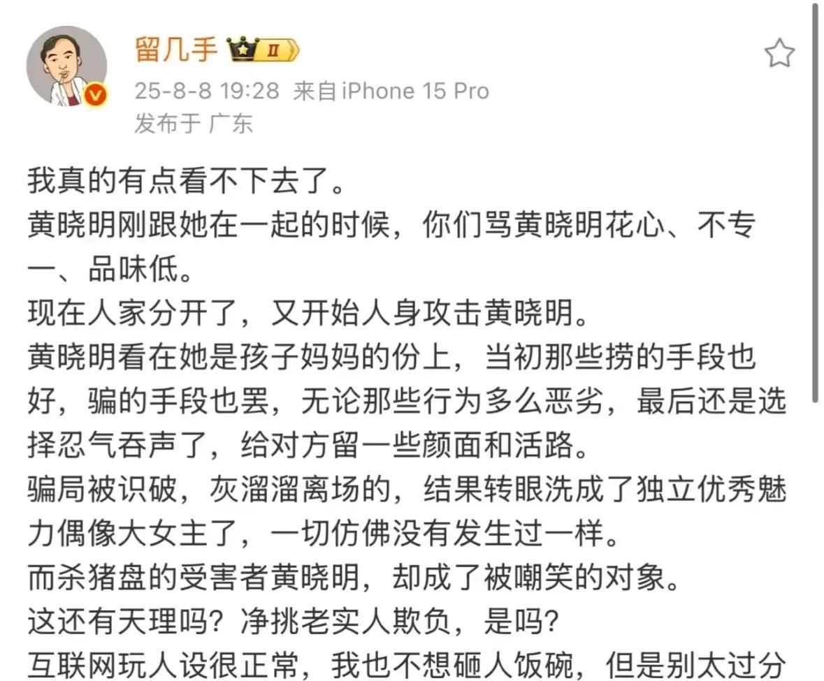 先有妖怪说黄晓明是个纯粹的好人,后有留几手义愤填膺地揭穿叶柯的杀猪盘,黄晓明的渣
