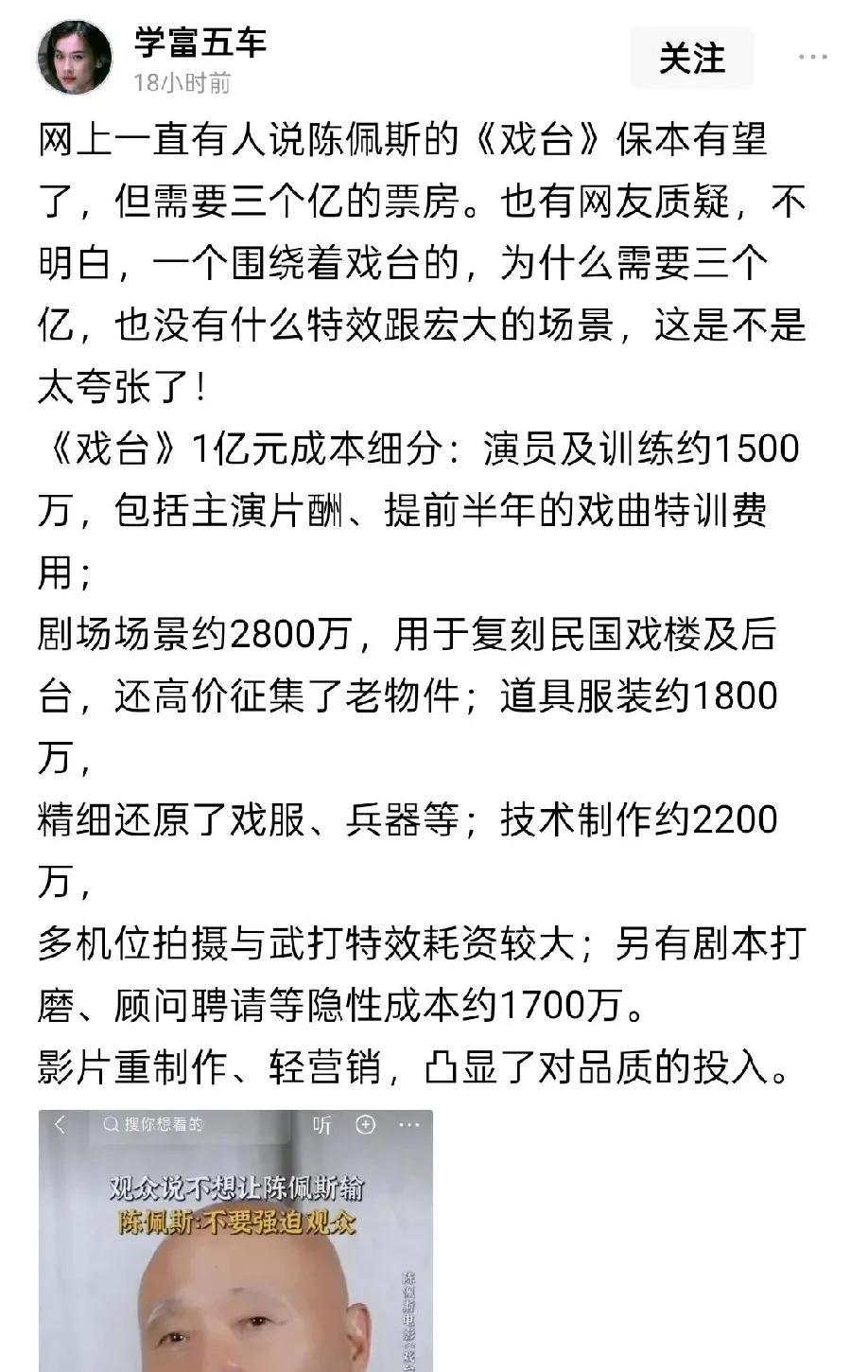 不知道是不是在演员导演的眼里,他们的人民币汇率和我们普通人不一样。一部电影动不动几个亿的成本,弄的好像比股票IPO成本还高! 我记得某部电影把他们打造的一个古城也算进去了,成本十个亿。我觉得以后要抵制虚假宣传的电影! 去年还是什么时候时候,满江红就几个小场景跑来跑去,宣传成本也是几个亿!不知道他们是把观众当傻子还是把成本宣传的这么高其实干些见不得人的勾当。