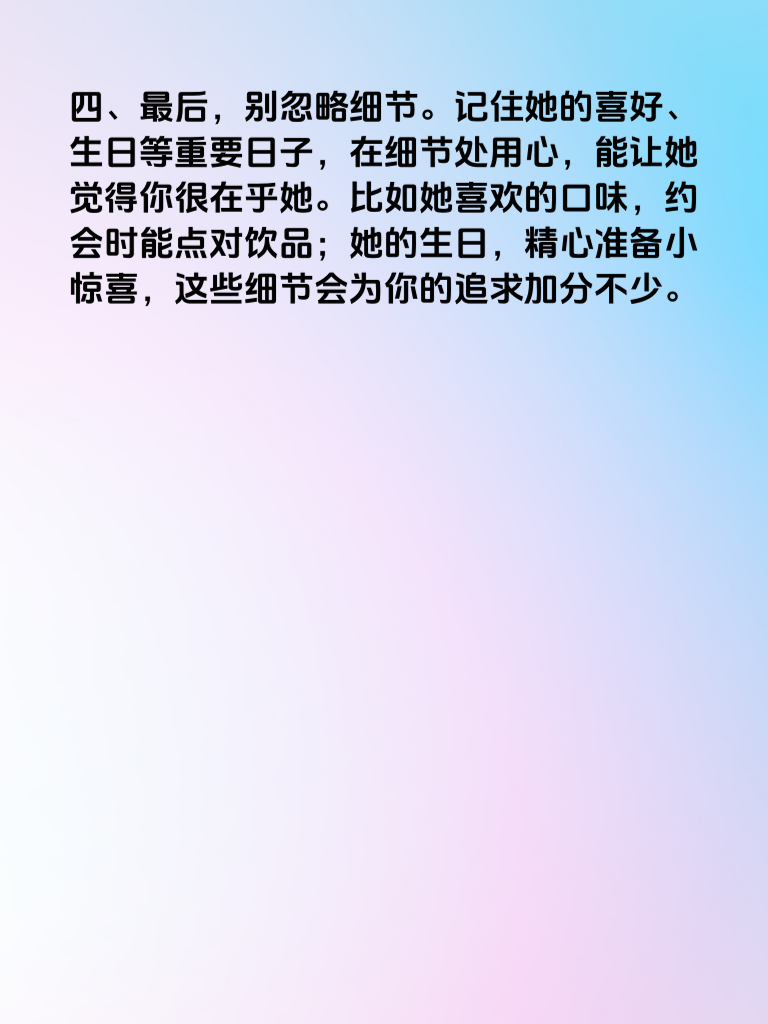 一、追求女生时,过度急切是个大雷区。别刚认识就一股脑把自己的全部想法和盘托出,比如未来规划、家庭背景等,会给女生压迫感。感情需要慢慢升温,循序渐进地展现自己,让她有时间去了解你。 二、不懂倾听也很糟糕。女生说话时,要耐心听她讲,不要急于打断。她分享生活点滴、喜怒哀乐,你认真回应,能让她感受到被重视。若总想着自己说,忽略她的感受,她会觉得你不尊重她。 三、还有,不要一味讨好。送昂贵礼物、无条件迁就她,这并非真爱。真正的爱是平等的,你要有自己的原则和态度,偶尔适当拒绝她不合理的要求,让她知道你是有主见的人,而不是只会围着她转。 四、最后,别忽略细节。记住她的喜好、生日等重要日子,在细节处用心,能让她觉得你很在乎她。比如她喜欢的口味,约会时能点对饮品;她的生日,精心准备小惊喜,这些细节会为你的追求加分不少。