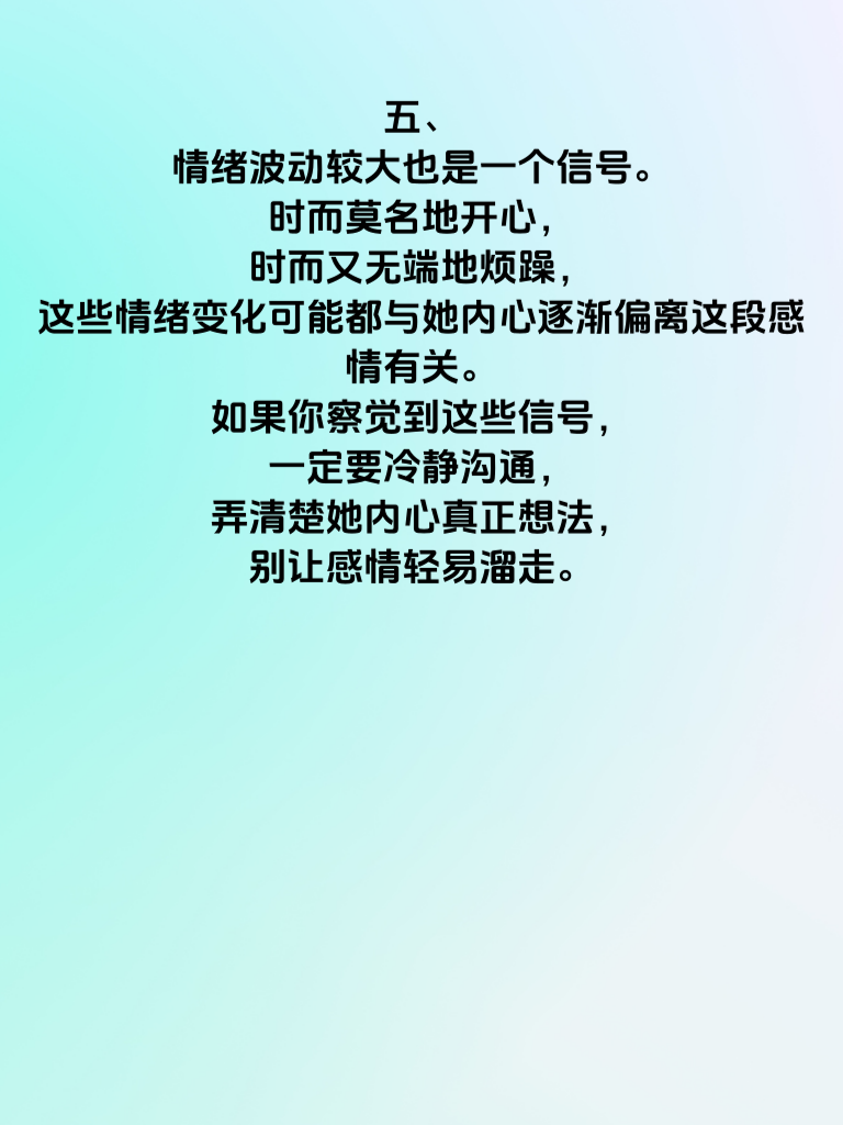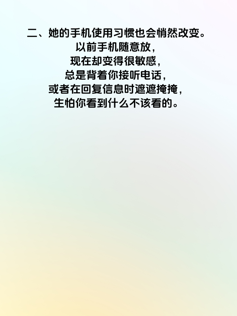一、女人出轨前,往往会在生活细节上露出蛛丝马迹。比如,她开始格外注重自己的外表,频繁购买新衣服、化妆品,精心打扮自己,仿佛要去赴一场重要约会。 二、她的手机使用习惯也会悄然改变。以前手机随意放,现在却变得很敏感,总是背着你接听电话,或者在回复信息时遮遮掩掩,生怕你看到什么不该看的。 三、日常相处中也有不同寻常之处。她可能会突然变得很忙碌,但又说不出具体忙些什么。对你们之间的亲密接触开始变得冷淡,不再像以前那样热情回应。 四、社交方面,她会结交一些新的朋友,而且对其中某些异性朋友格外关注。总是不自觉地提起他们,并且出去聚会的次数也增多了。 五、情绪波动较大也是一个信号。时而莫名地开心,时而又无端地烦躁,这些情绪变化可能都与她内心逐渐偏离这段感情有关。如果你察觉到这些信号,一定要冷静沟通,弄清楚她内心真正想法,别让感情轻易溜走。"