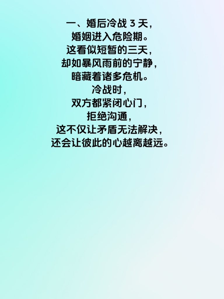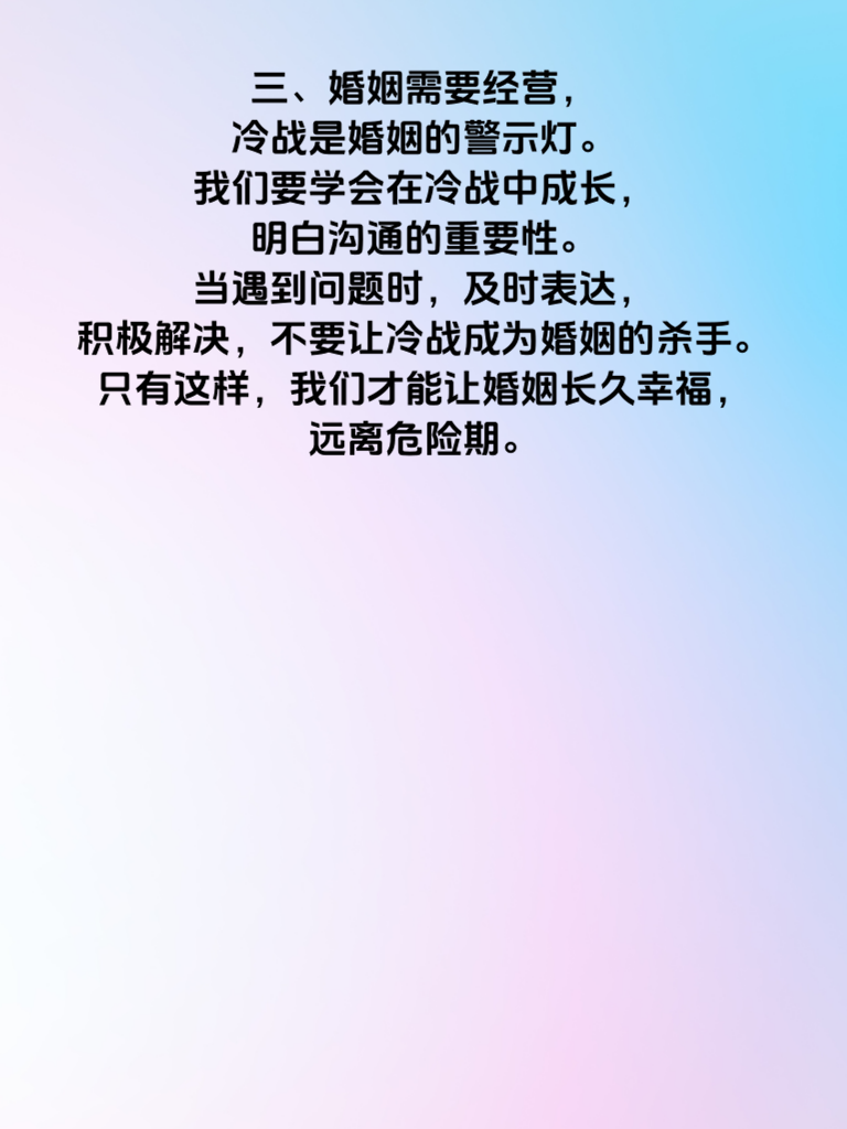 一、婚后冷战3天,婚姻进入危险期。这看似短暂的三天,却如暴风雨前的宁静,暗藏着诸多危机。冷战时,双方都紧闭心门,拒绝沟通,这不仅让矛盾无法解决,还会让彼此的心越离越远。 二、冷战往往源于一些小事,比如意见不合、生活琐事等。但它却能像滚雪球一样,越积越大。此时,双方都应冷静下来,反思自己在冷战中的行为。主动打破沉默,真诚地与对方交流,说出自己的感受和想法,而不是一味地等待对方先低头。 三、婚姻需要经营,冷战是婚姻的警示灯。我们要学会在冷战中成长,明白沟通的重要性。当遇到问题时,及时表达,积极解决,不要让冷战成为婚姻的杀手。只有这样,我们才能让婚姻长久幸福,远离危险期。