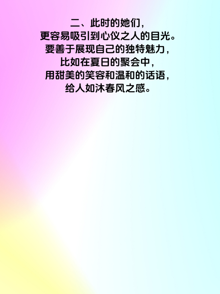一、生肖兔的女生,温柔似水,内心细腻,在盛夏这个热情似火的季节里,她们的桃花也将如绚烂的烟火般璀璨绽放。 二、此时的她们,更容易吸引到心仪之人的目光。要善于展现自己的独特魅力,比如在夏日的聚会中,用甜美的笑容和温和的话语,给人如沐春风之感。 三、不妨多参与一些户外活动,像是野餐、露营等。在大自然的怀抱中,让自己的纯真与活力自然流露,吸引那个懂你的他。 四、而且生肖兔女生心思缜密,能敏锐捕捉他人情绪。聊天时多倾听、适时回应对方内心的想法,会让他觉得你格外贴心。 五、当桃花盛夏来袭,生肖兔女生要自信地迎接。用真诚和热情去对待每一次相遇与交流,相信爱情会在这个美好的季节悄然降临。