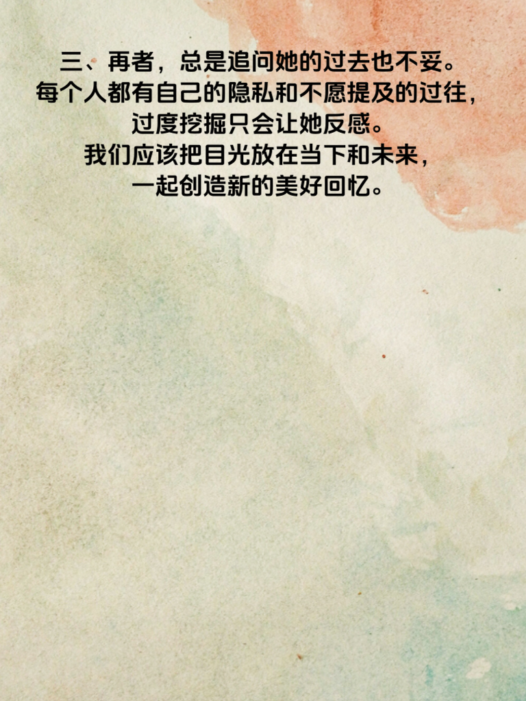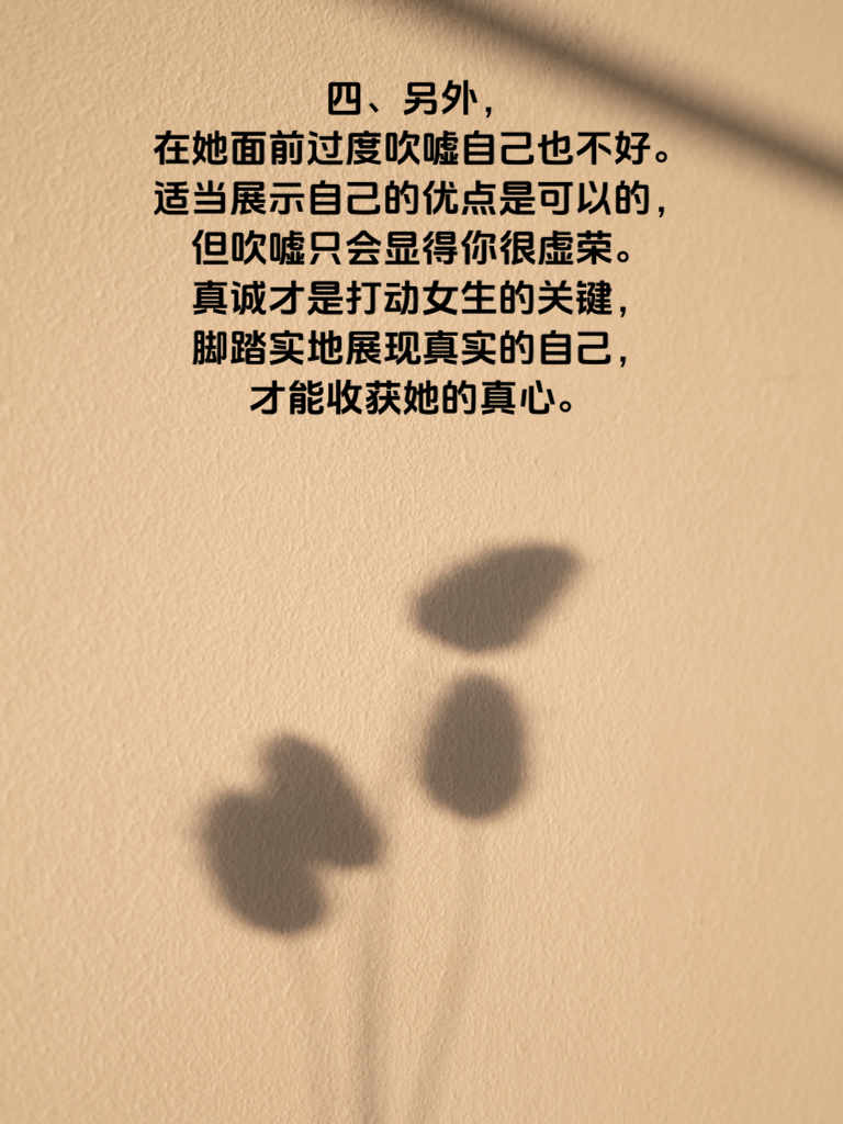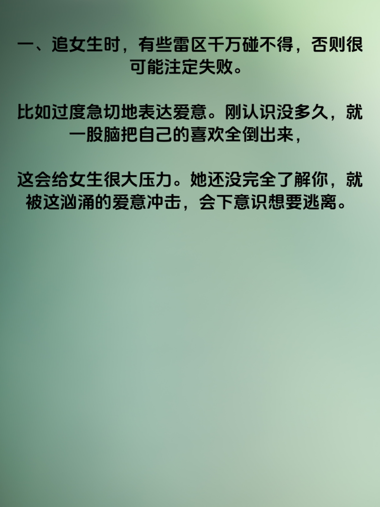一、追女生时,有些雷区千万碰不得,否则很可能注定失败。比如过度急切地表达爱意。刚认识没多久,就一股脑把自己的喜欢全倒出来,这会给女生很大压力。她还没完全了解你,就被这汹涌的爱意冲击,会下意识想要逃离。 二、还有一味地讨好迎合也不行。为了让她开心,什么都顺着她,失去了自己的原则和个性。这样她很快就会觉得你无趣,没有吸引力。真正的相处是平等且相互尊重的。 三、再者,总是追问她的过去也不妥。每个人都有自己的隐私和不愿提及的过往,过度挖掘只会让她反感。我们应该把目光放在当下和未来,一起创造新的美好回忆。 四、另外,在她面前过度吹嘘自己也不好。适当展示自己的优点是可以的,但吹嘘只会显得你很虚荣。真诚才是打动女生的关键,脚踏实地展现真实的自己,才能收获她的真心。