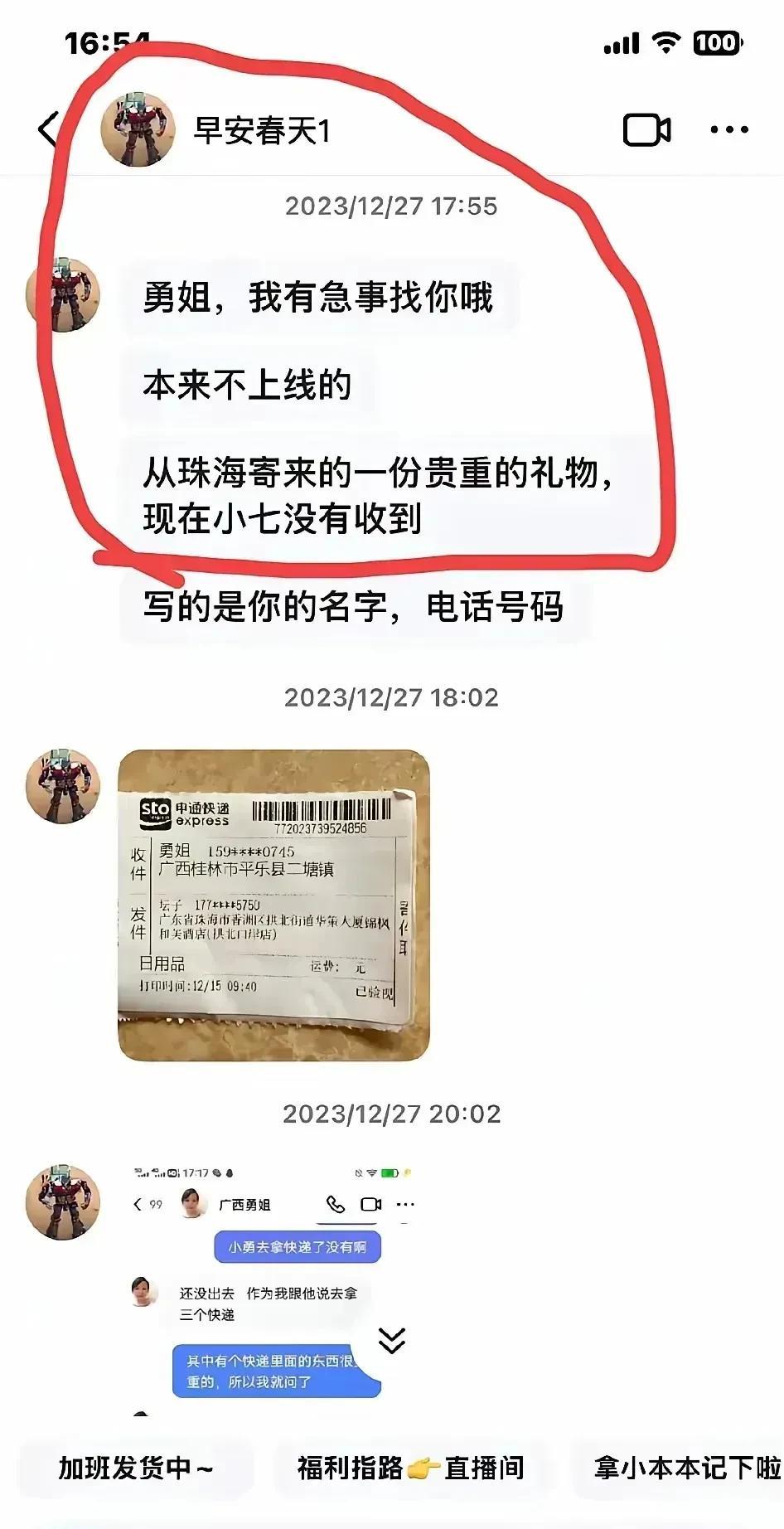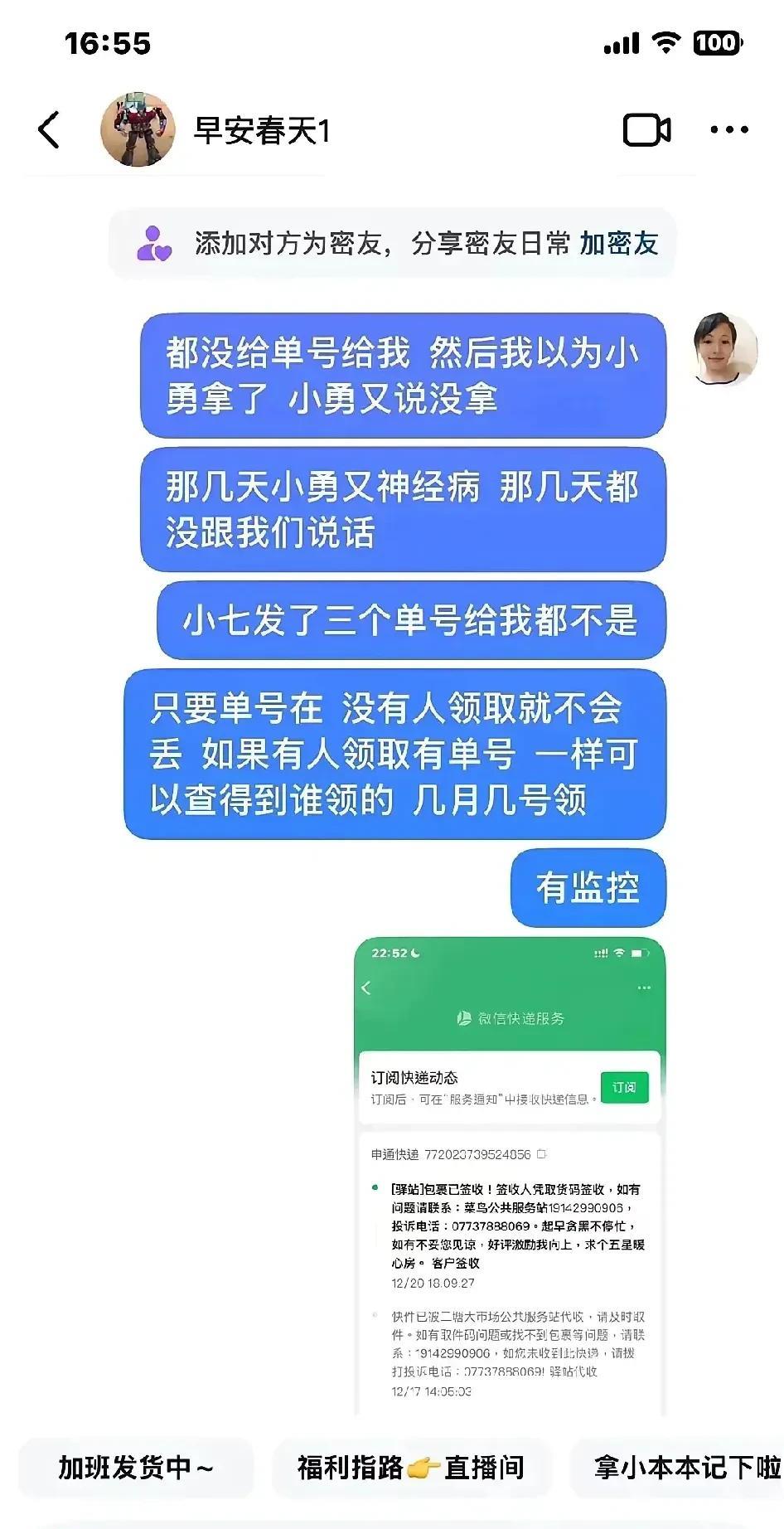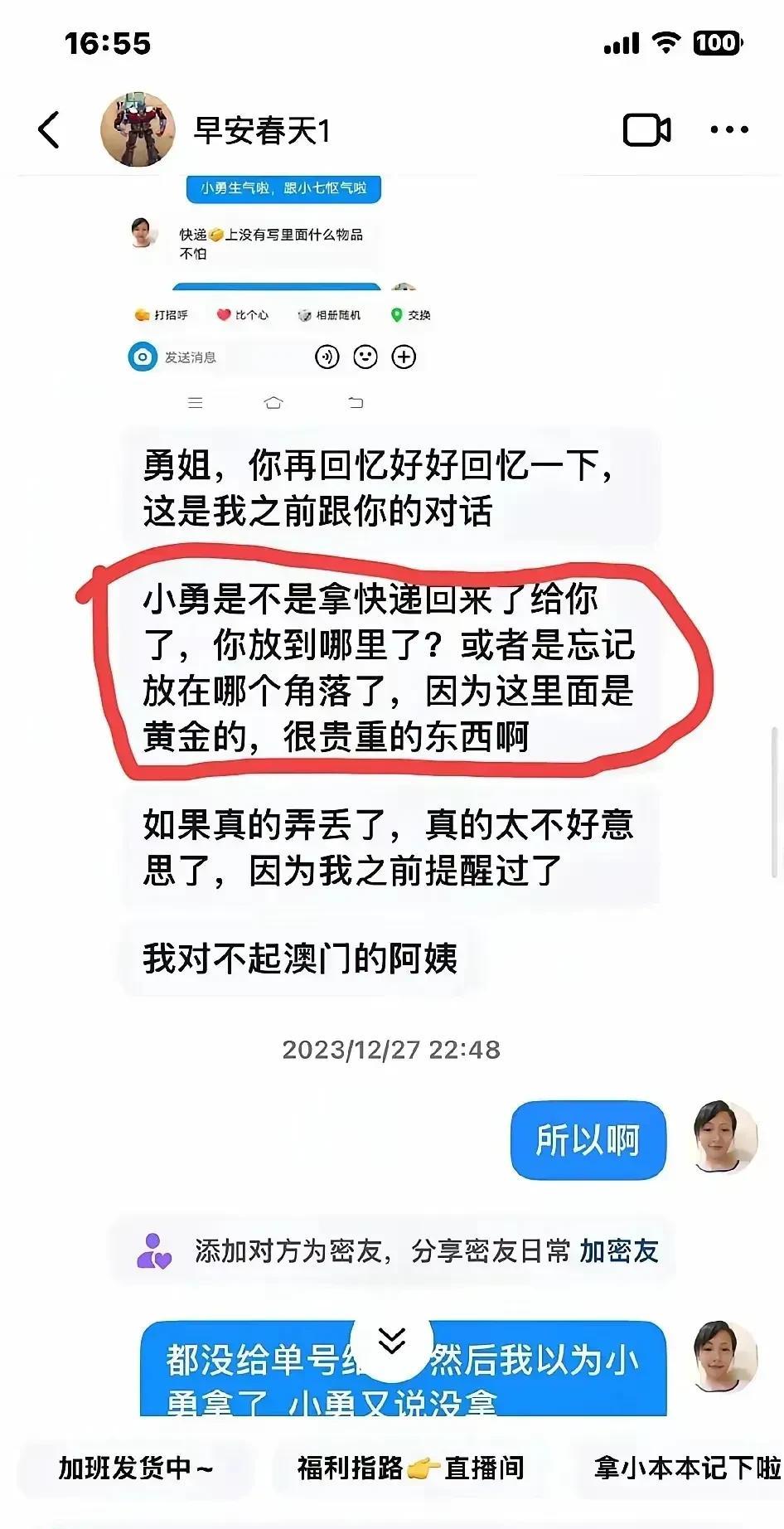 小勇和小七在网上互撕,现在进入了白热化阶段。 此时,勇姐又丢出一颗重磅炸弹。 就是之前有一位小七的粉丝竟然通过快递给她寄了一个金手镯。价值上万元。 但签收时,由于小七不在家,勇姐就签收了。幸亏她拍了视频,要不然后面的事情说不清了。 这粉丝也说,这个手镯是送给小七的,说这个东西很宝贵,一定要保管好。 这件事情的出现让小勇和小七之间的关系更加变得扑朔迷离。 小七到底有没有背着小勇做一些其他事情?现在更加不好说了。网友们也纷纷站队,目前形势越来越复杂。真相到底是什么?值得期待。