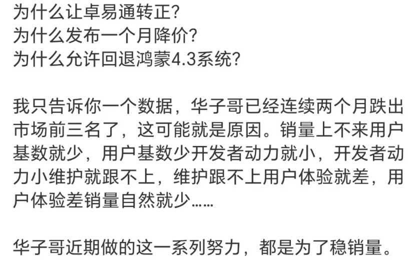 没有销量就没有发展,原生鸿蒙离不开用户基数,开发者才有动力,事到如今,华为也是拼了,为了稳住销量,也为了原生鸿蒙的长远发展,适当做出让步是合情合理的。不过,想要回退,得去官方授权店,说白了,就是刷机。