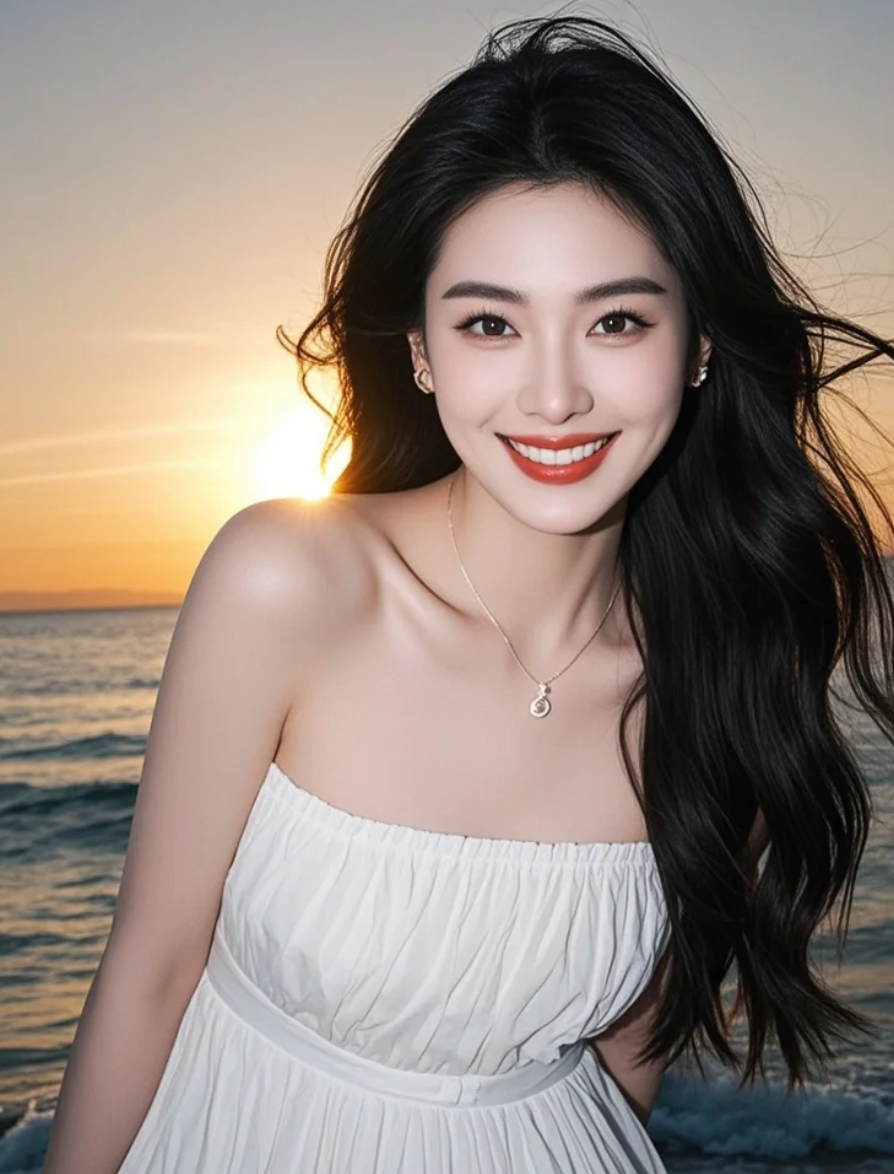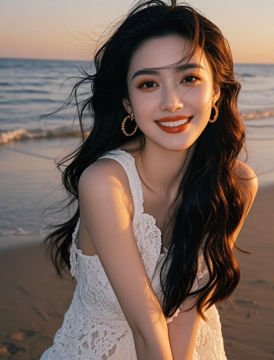 夕阳熔金,裙裾如焰,她是海岸线上最亮的星