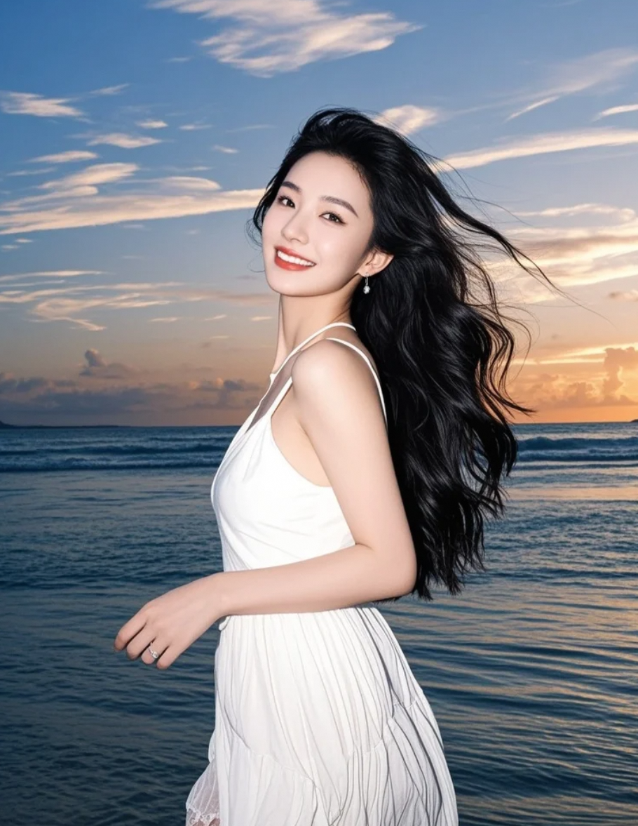 夕阳熔金,裙裾如焰,她是海岸线上最亮的星