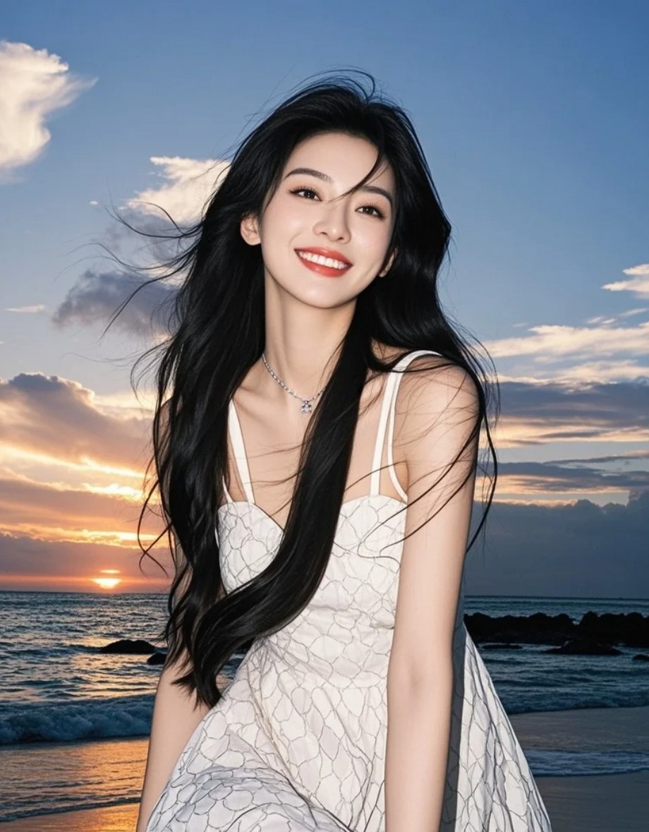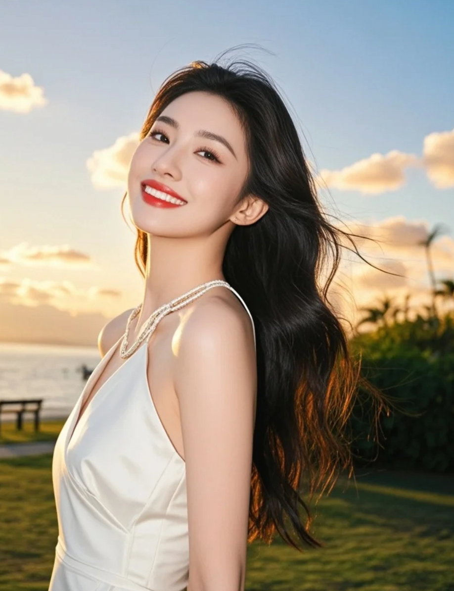 夕阳熔金,裙裾如焰,她是海岸线上最亮的星