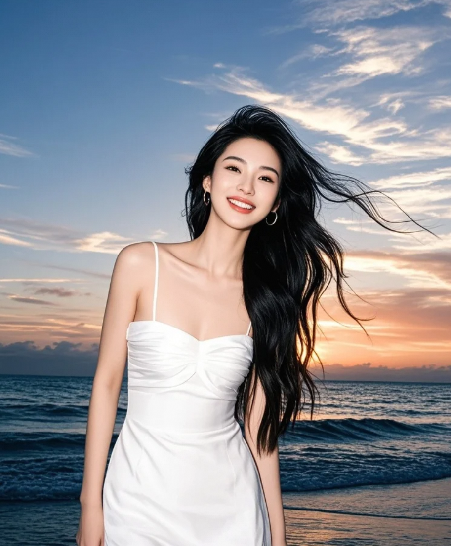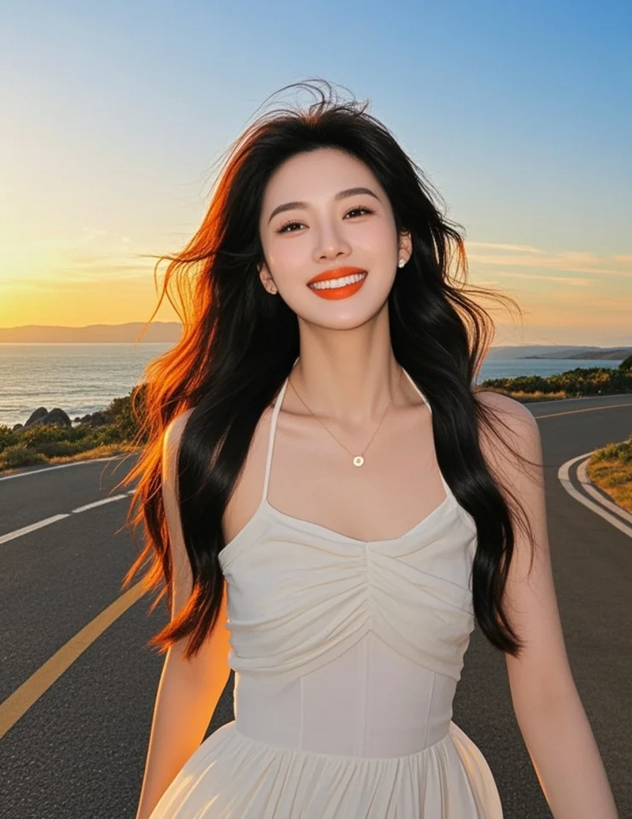 夕阳熔金,裙裾如焰,她是海岸线上最亮的星