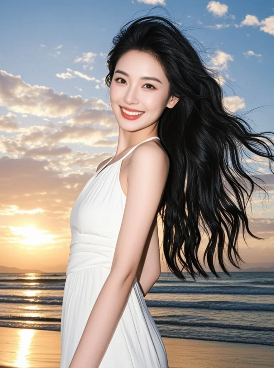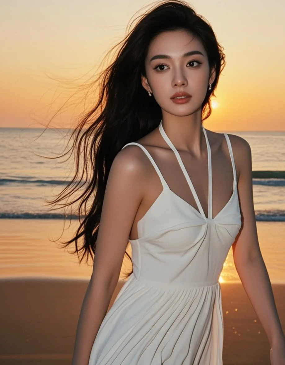夕阳熔金,裙裾如焰,她是海岸线上最亮的星